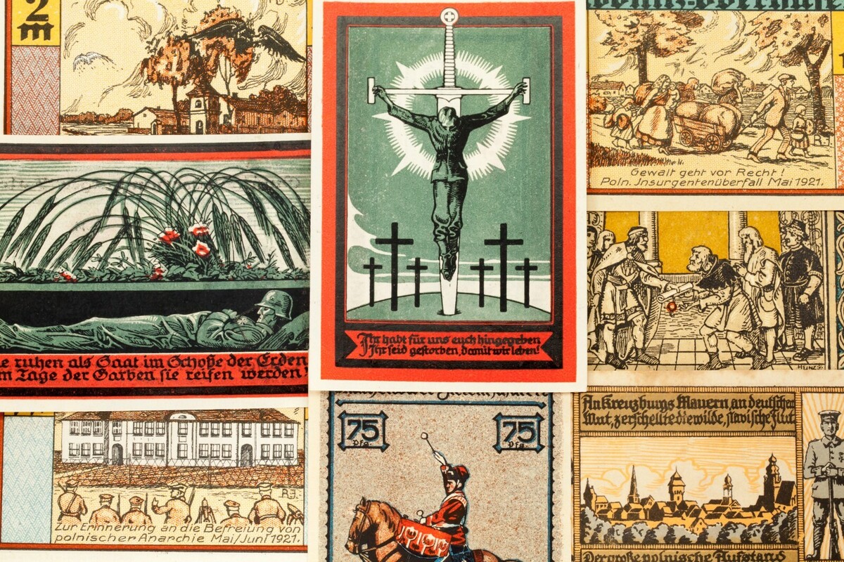 This lot will include 20 individual notgeld notes from Germany after World War I. All will be in Extra Fine to Uncirculated (XF-UNC) condition. Face values between 5 pfennig to 5 mark. Military and political theme.