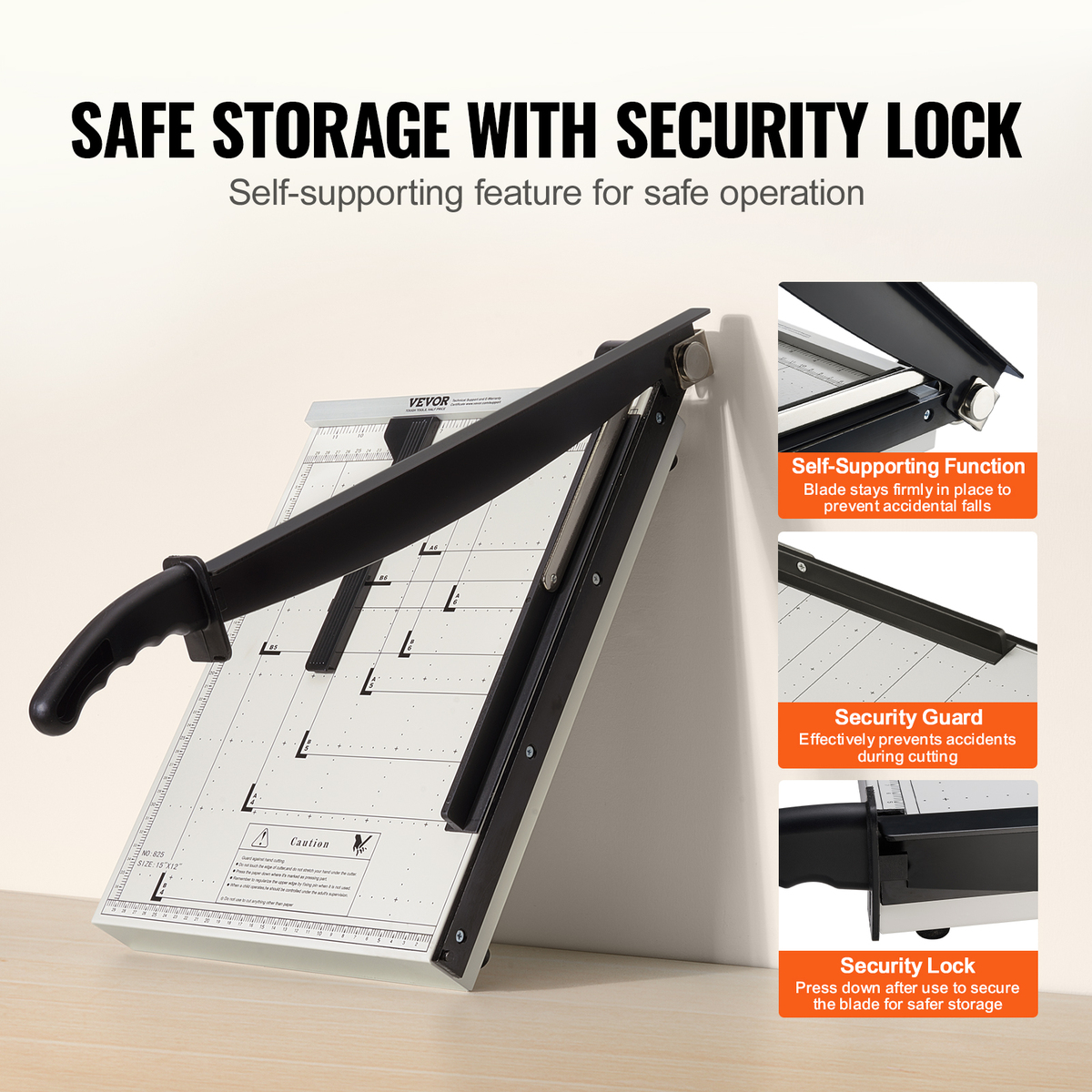 Security First: Your security matters to us. Our paper cutter guillotine features a self-supporting blade design for secure and stable cutting. Plus, it comes with a guard rail and blade lock for peace of mind during use and storage.