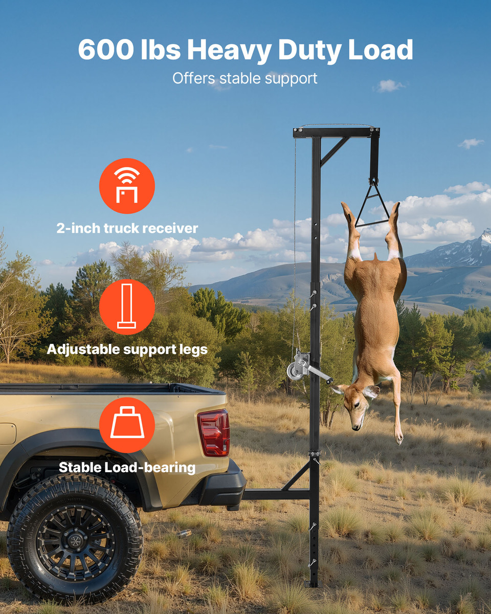 Versatile Use: Our hunting game hoist is equipped with a 2-inch truck hitch, compatible with various vehicle types. Ideal for outdoor hunting, farm animal lifting, fruit/vegetable transport, or lifting heavy items outdoors