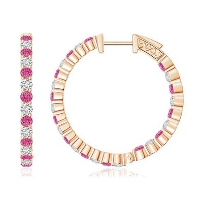 Elegant and colorful, our finely handcrafted hoop earrings with unique detailing are fabulous for anytime glamour. The pair features perfectly matched pink sapphires and diamonds alternately lined on both inside and outside edges with secured hinge backs. Further, elaborative cutwork near the locks gives these gemstone hoop earrings a state-of-the-art touch that every woman desired in her fine jewelry.