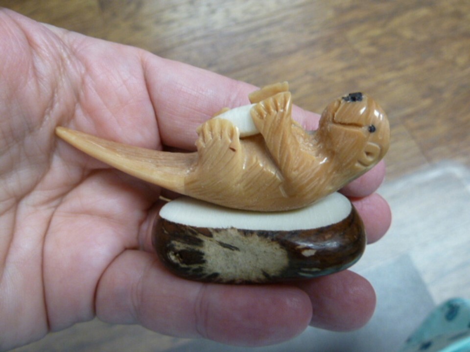(#TNE-OTT-524-D) Excellent hand crafted tagua nut figurine of a little brown, sea or river OTTER (NUTRIA) FLOATING ON BACK WITH SHELL on a tagua nut base; measures 3? long x 1-1/4? wide x 1-5/8? tall.