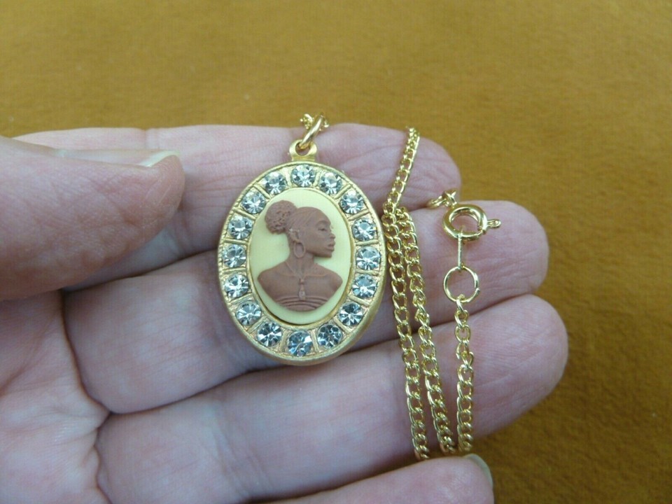 (CA30-131) RARE African American LADY white + brown CAMEO brass pendant necklace