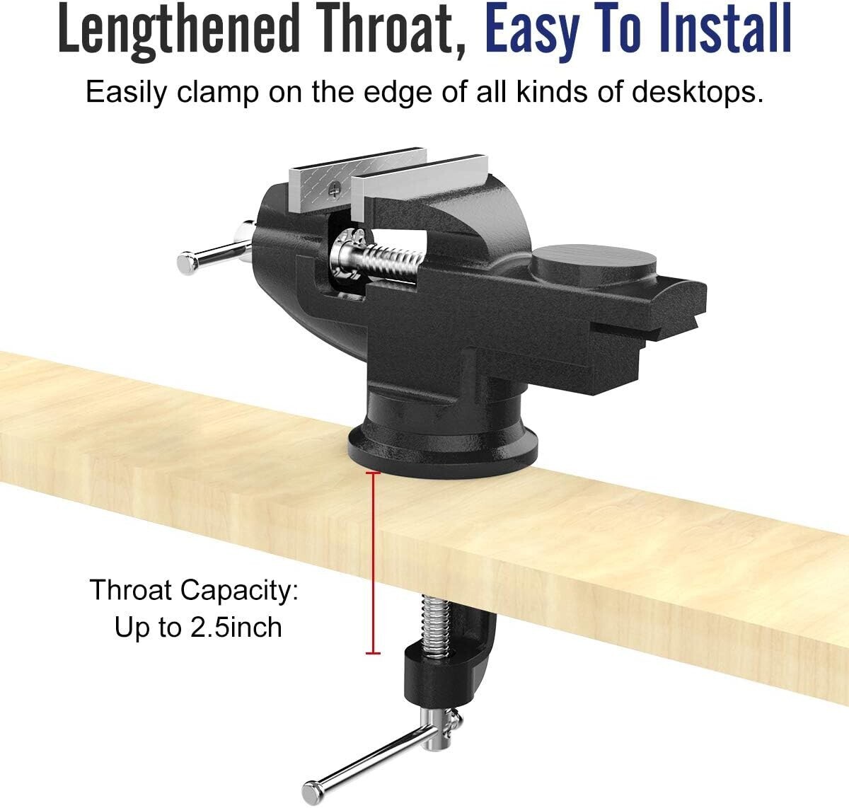 360 Degree Swivel Base: The throat capacity is up to inch/61mm. Build in 360 dergree swivel base, perfect for a wide range of clamping angles. Even if you are a left-hander, you can rotate the vise to the position that suits your work.