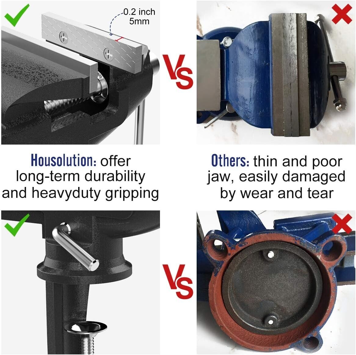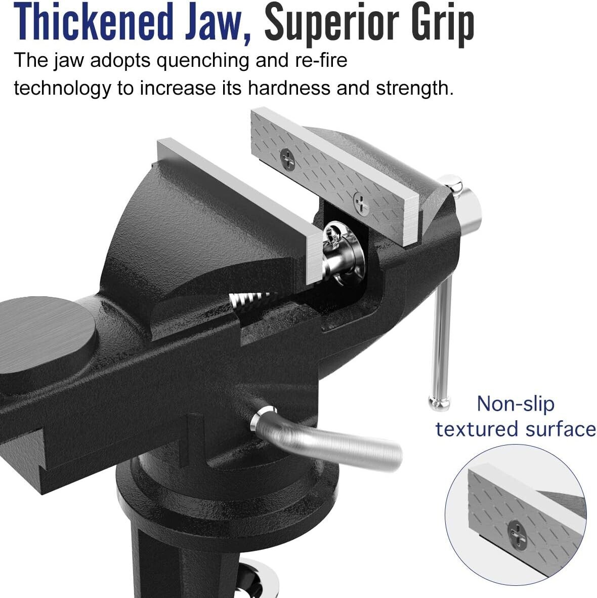 Easy to Install: The oval swivel base design is convenient and quick to install on or remove from kinds of workbench. Non-slip textured surface increases the grip force of jaw, which firmly hold the material, save time and effort when you work. (Note: The table board up to inch/61mm thick can be clamped.)
