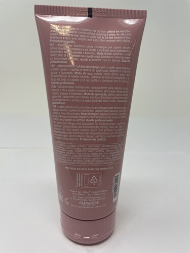 Alfaparf Milano Semi Di Lino Moisture Nutritive Leave-in Conditioner is an Italian professional salon quality product for dry hair. The sulfate, SLS, paraben and parifin free conditioner softens the hair fiber and makes it easier to control without weighing it down. The color safe hair product helps dry hair quickly regains a healthy, radiant, soft and silky appearance. The conditioner is kind to your skin, hair and color. The rich texture nourishes deep down to make hair easier to manage. The leave in conditioner has a fragrance that is fruity, flowery, and gourmand. The specific active ingredient is an oil derived from meadow foam seed which contains beneficial conditioning and emollient properties. The Semi Di Lino Moisture Nutritive Conditioner contains four unique complexes that protect and revitalize hair. It includes Honey Nutria-Sugars which are substances with a high affinity to water. They are able to retain water inside the hair fiber which rehydrates and nourishes the hair intensely. Urban Defense Pro protects the hair fiber from pollutants and heavy metals by carrying out a film-forming action. Shine Fix Complex is a flaxseed extract which has been reprocessed to give extraordinary long-lasting shine. Color Fix Complex is a UV filter, antioxidant and high-performing formula for protection of cosmetic color. Semi Di Lino is Italian for flax seed.