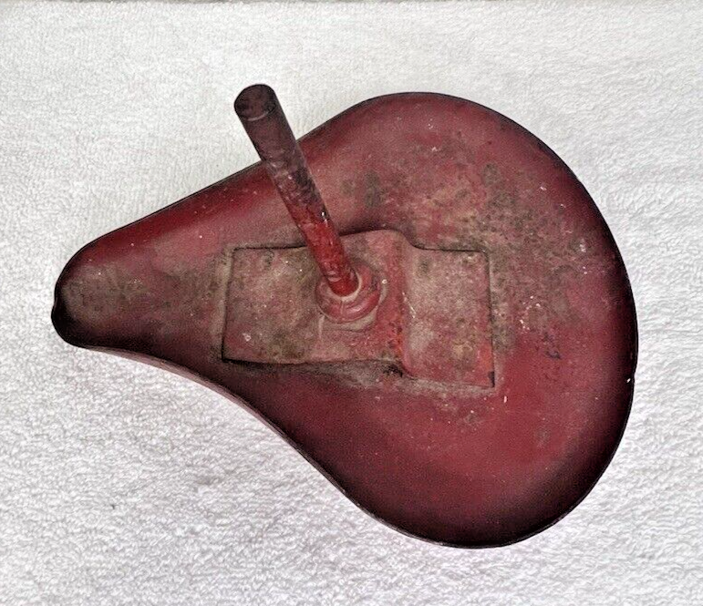 Antique Metal Toy Seat Red Bike Tricycle Pedal Car Solid Metal Ok the paint is worn it has faint rust on the underside please read below to see size. We have NO IDEA what this goes to. It measures 8 inches front to back 6 1/4 across the widest part and the spike is 3.5 inches long the paint is very worn the seat weights 13 oz on its own so 1 pound for shipping
