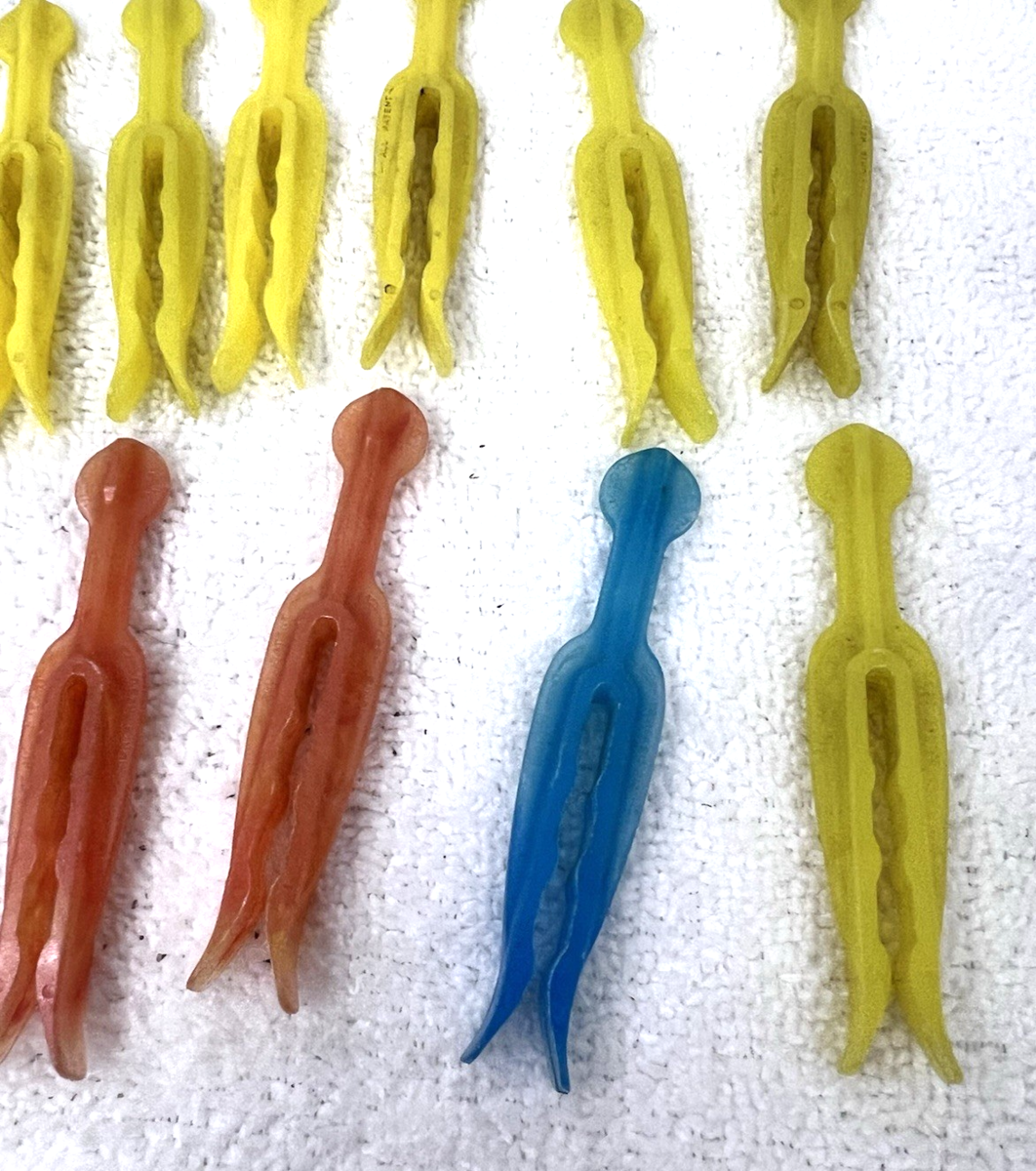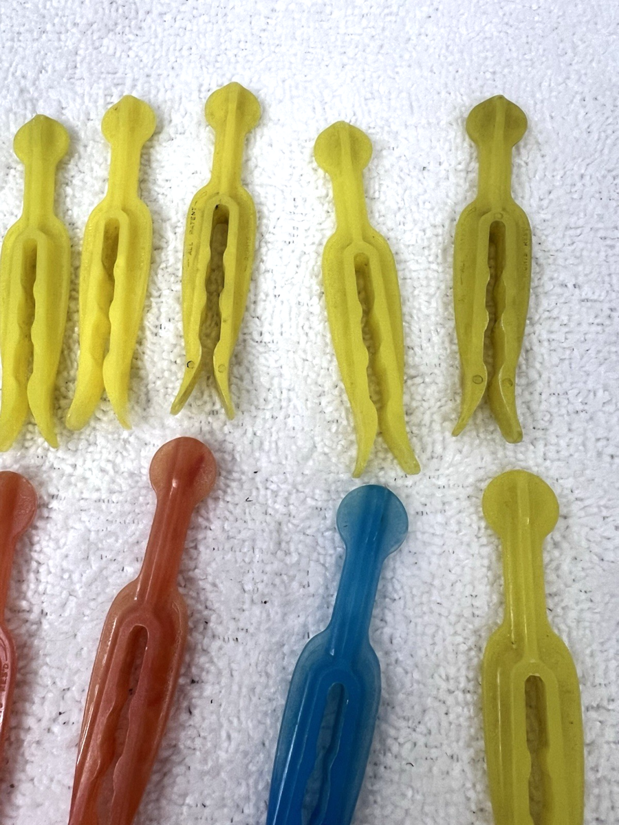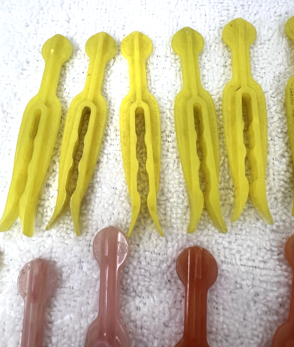 Lot of 15 Vintage Bulldog Clothesline Clothespins Clips Yellow Pink Blue Orange
