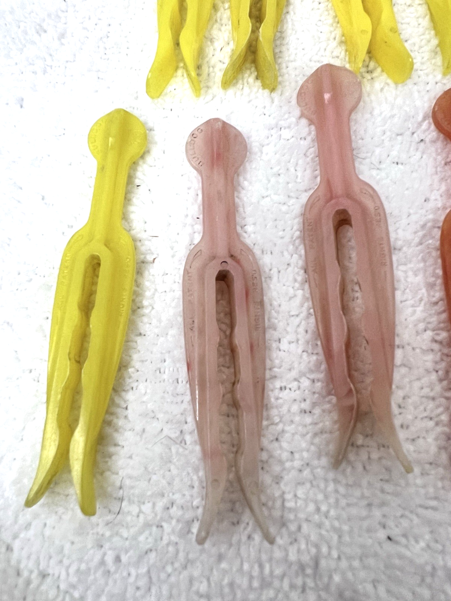 Lot of 15 Vintage Bulldog Clothesline Clothespins Clips Yellow Pink Blue Orange Some color fading but in good shape