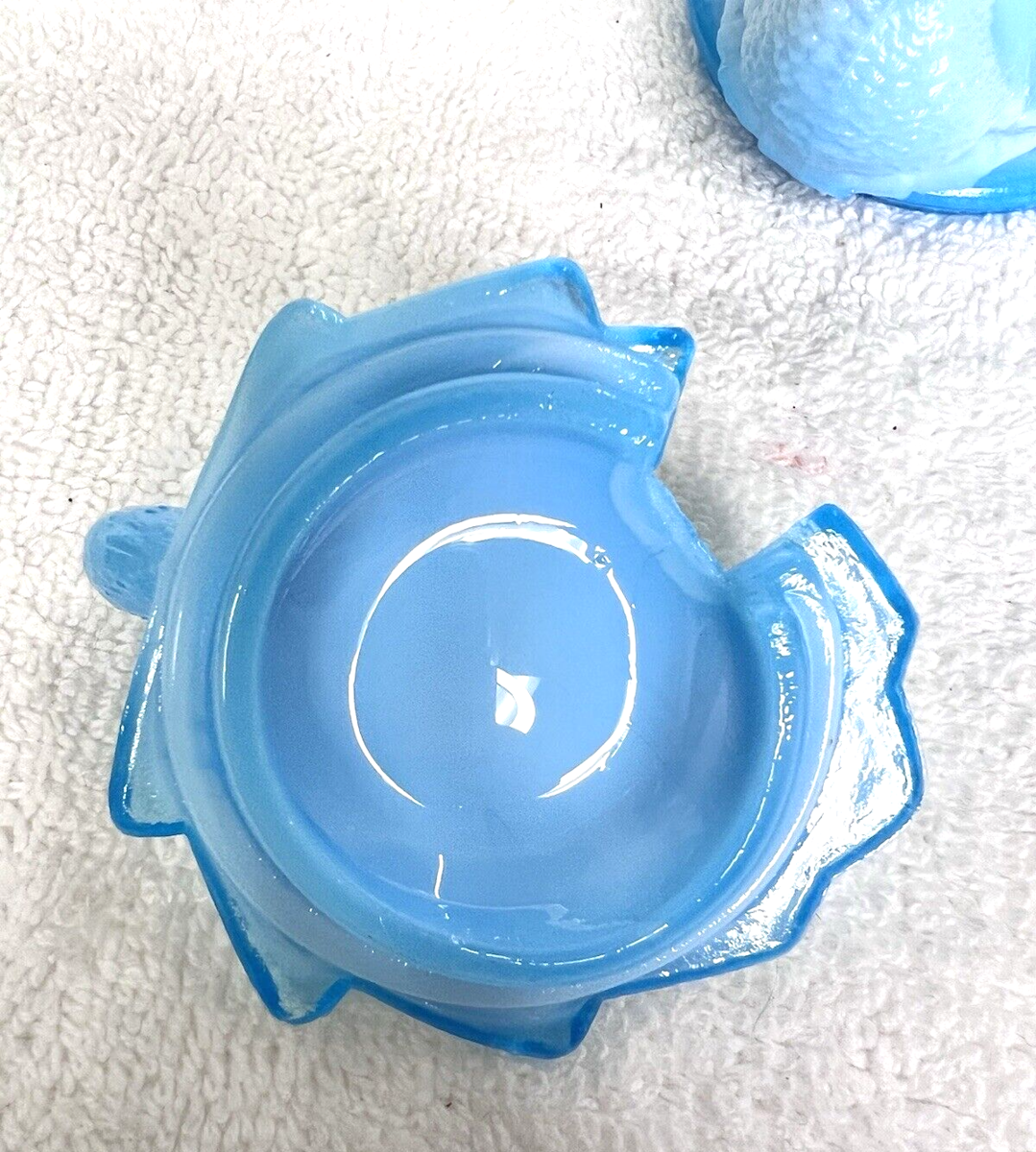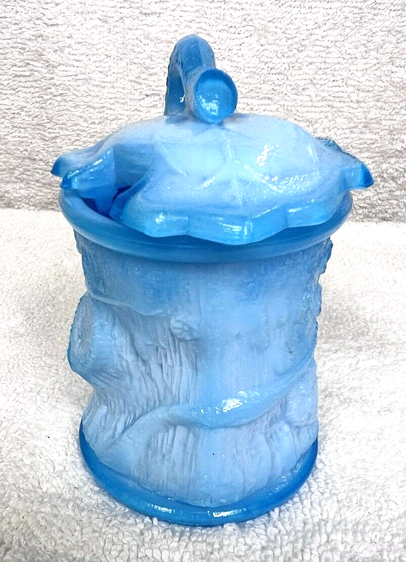 Vintage McKee Blue Opaline Milk Glass Condiment Jar Bird on Tree Stump 3 3/4" to top of lid 2 3/4 inches across the widest part of the base