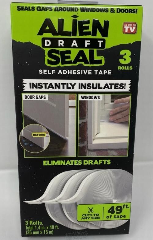 The Alien Door Window Seal Tape is a self-adhesive stripping product designed to provide insulation for doors and windows. With a length of 49 feet and a width of 1.4 inches, this clear adhesive strip is perfect for sealing drafts and preventing hot or cold air from escaping. Made by As Seen on TV, this pack includes 3 rolls of the insulating tape, making it easy to apply and achieve a secure seal for your home.