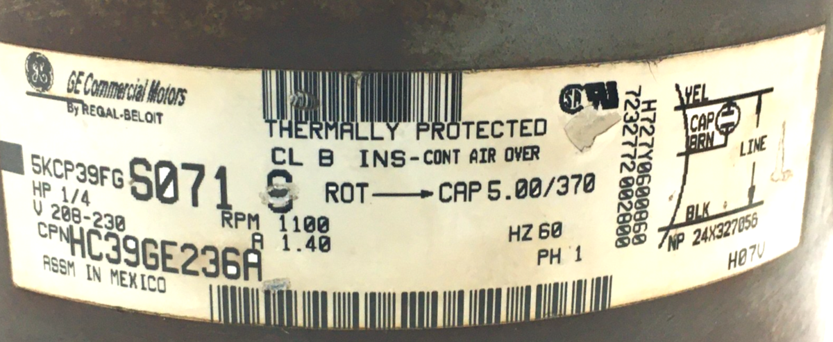 This is GE 5KCP39FGS071S Condenser FAN MOTOR 1/4 HP 208/230V HC39GE236A 1100RPM 60Hz used part.