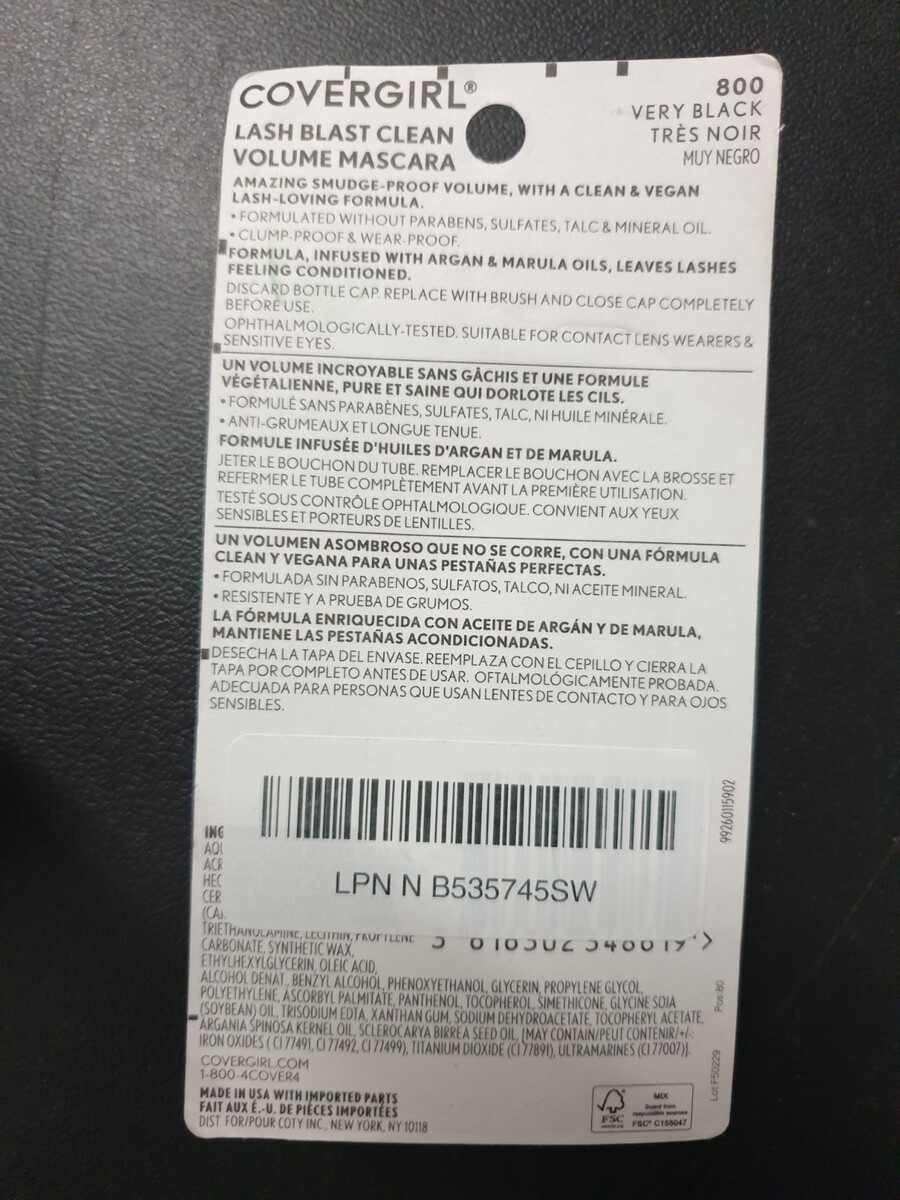 CoverGirl Lash Blast Clean Volume Mascara Vegan Smudge-Proof #800 Very Black.