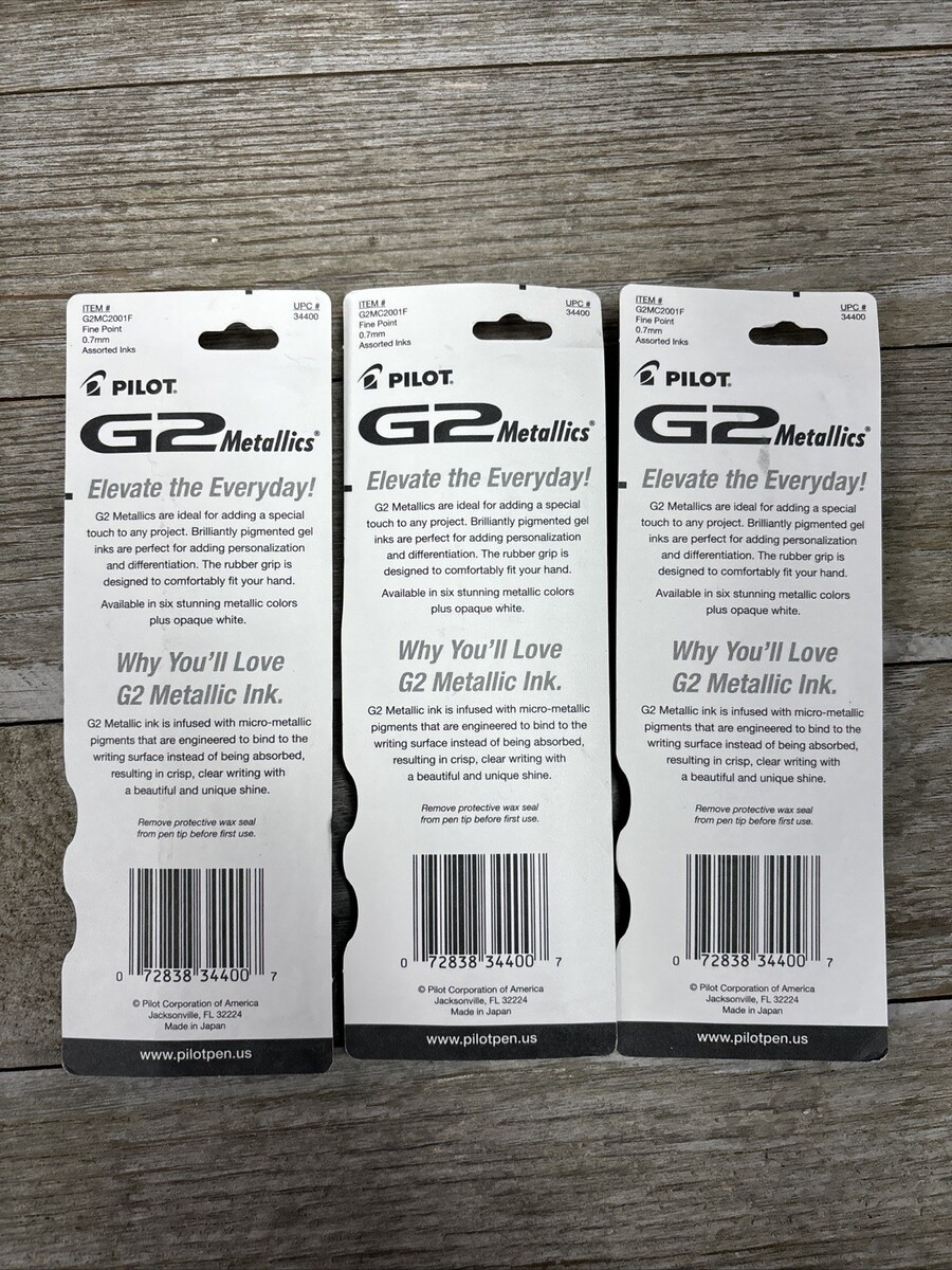 The product is a set of three Pilot G2 Metallics Retractable Gel Ink Rollerball Pens in gold and silver colors. These pens are made of plastic and are known for their brilliant metallic ink that dries quickly and offers a smooth writing experience. Originating from Japan, these pens are a stylish and high-quality option for collectors or everyday users looking for unique and eye-catching writing instruments. package may contain shelfware.