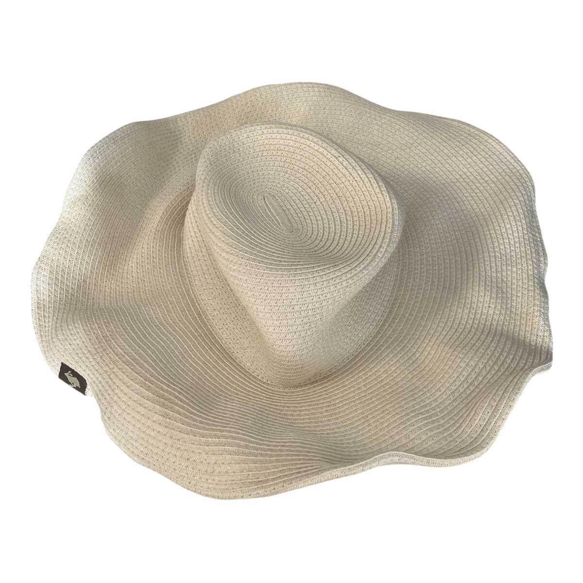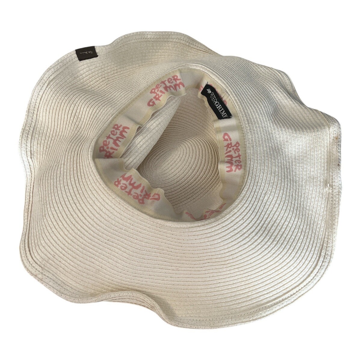 Peter Grimm wide brim floppy sun hat in a soft cream tone, featuring a wire-reinforced hem that allows the brim to be shaped and molded as desired. Lightweight woven construction with a relaxed, flowing silhouette that can be styled flat, waved, or turned up at the edges. Interior includes a Peter Grimm branded stretch band for a comfortable, flexible fit. Ideal for beachwear, travel, and sun protection with adjustable styling.