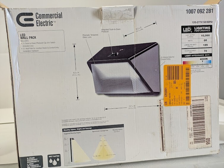 This energy-efficient wall pack is uniquely designed to cover a large outdoor area using precision forward-throw optics to focus 10000 Lumens of 4000K bright white light toward the ground and prevent it from escaping toward the sky. Installation is hands-free and a leveling bubble inside the box ensures a straight mount. Let the dusk to dawn photocell technology automatically turn the light on at sunset and off at sunrise. The aluminum housing resists corrosion for more than 50,000 hours of maintenance-free use.