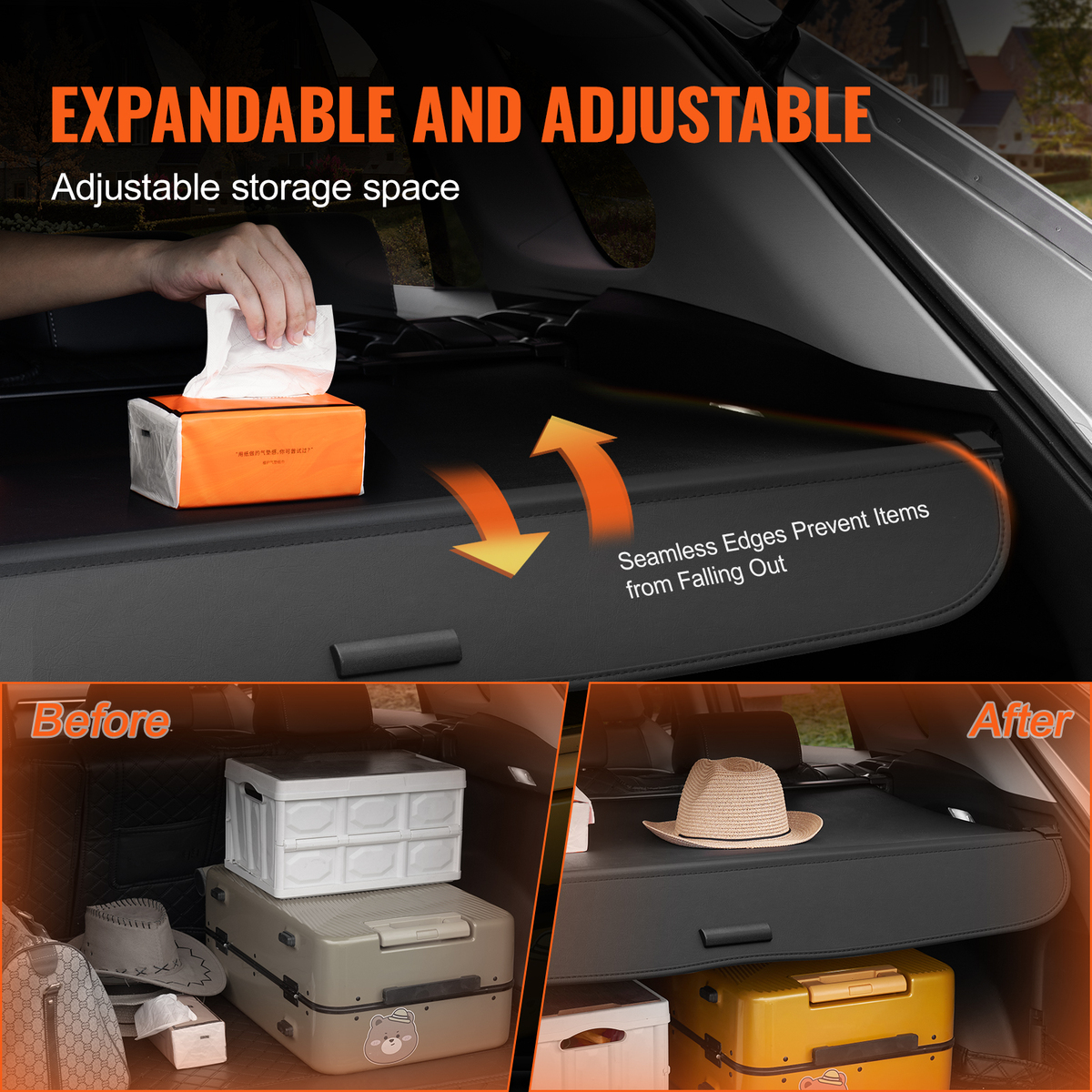 Flexible Retractable Design: The retractable design offers flexibility, allowing you to expand storage space or retract for an open cargo area effortlessly. Additionally, there is no gap between the luggage compartment cover and the last row of seats, so you don't have to worry about items falling from the cargo cover while driving.