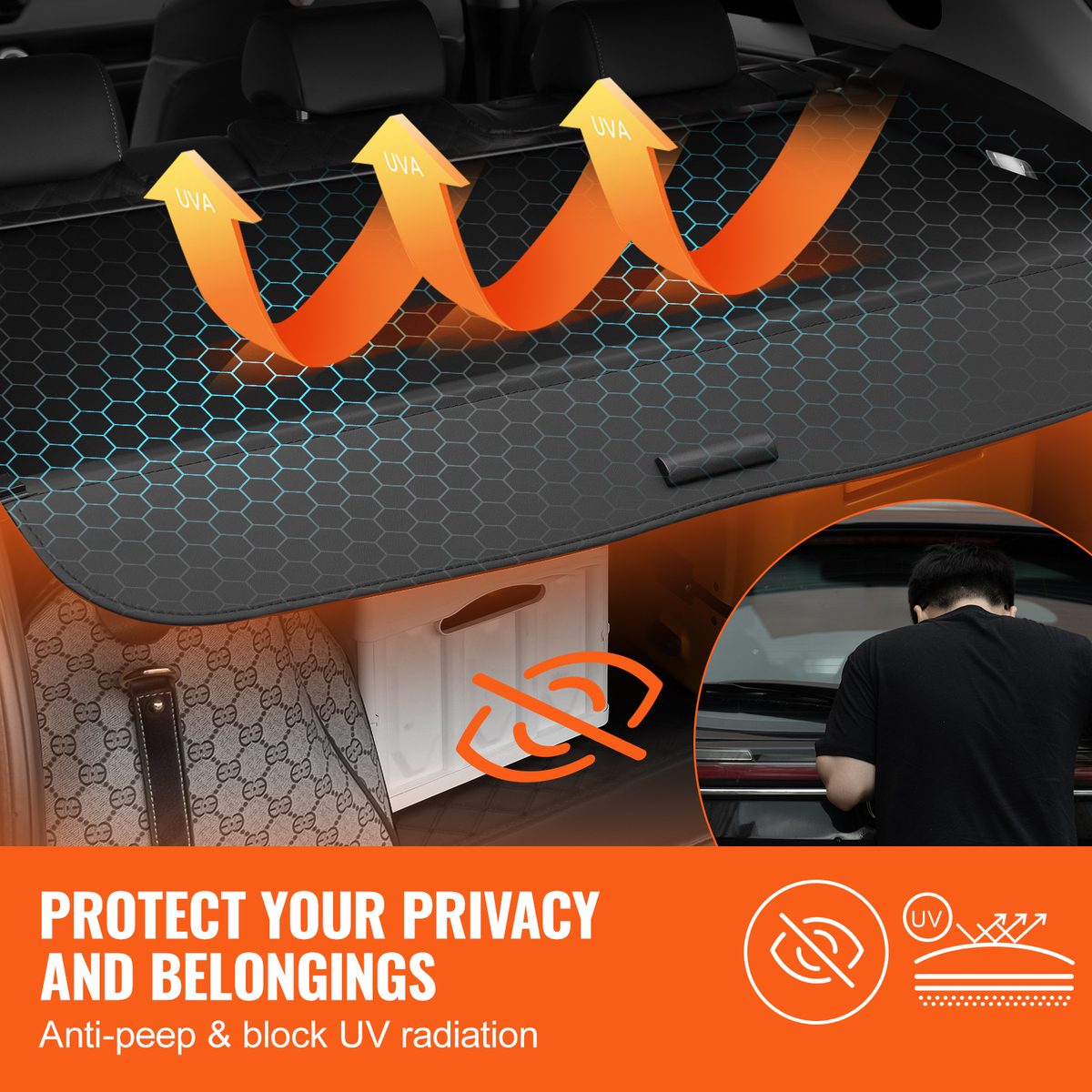 Safety Protection: This cargo cover provides excellent privacy protection all around, shielding your belongings from UV damage and keeping them securely hidden, enhancing security and peace of mind.