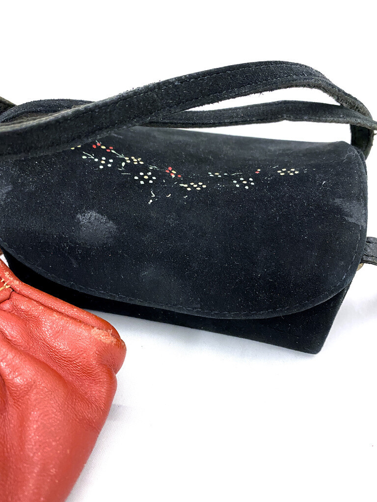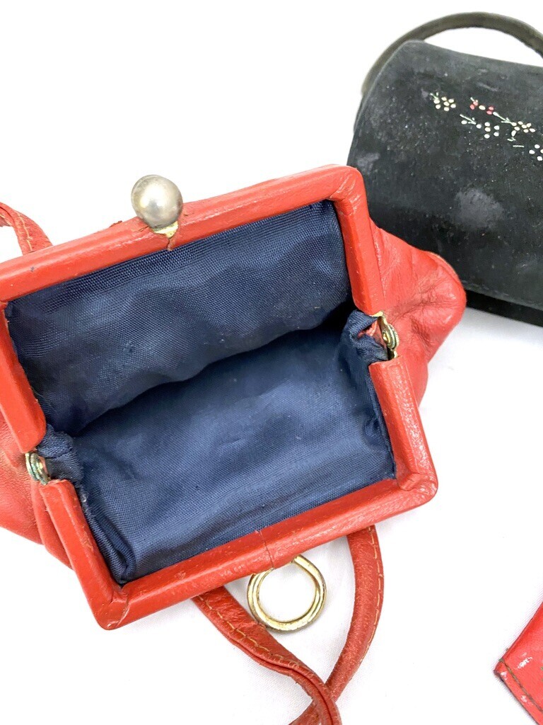 Adorable little girls purses from the 1950s. Could used as costume, The change purse has no flaws, but the red leather has chewed up handles and there's a mark of the suede of the hand painted black box purse.App. 5" long. See photos for damage.