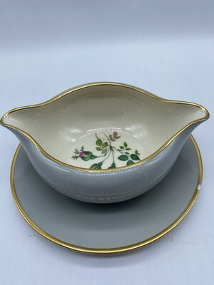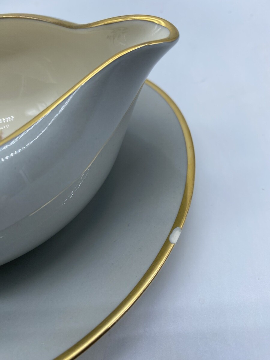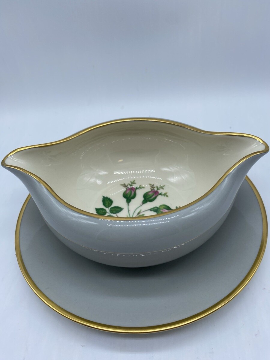 Flintridge China San Marino Rose Gravy Boat Attached Underplate Gray Gold Bs318
