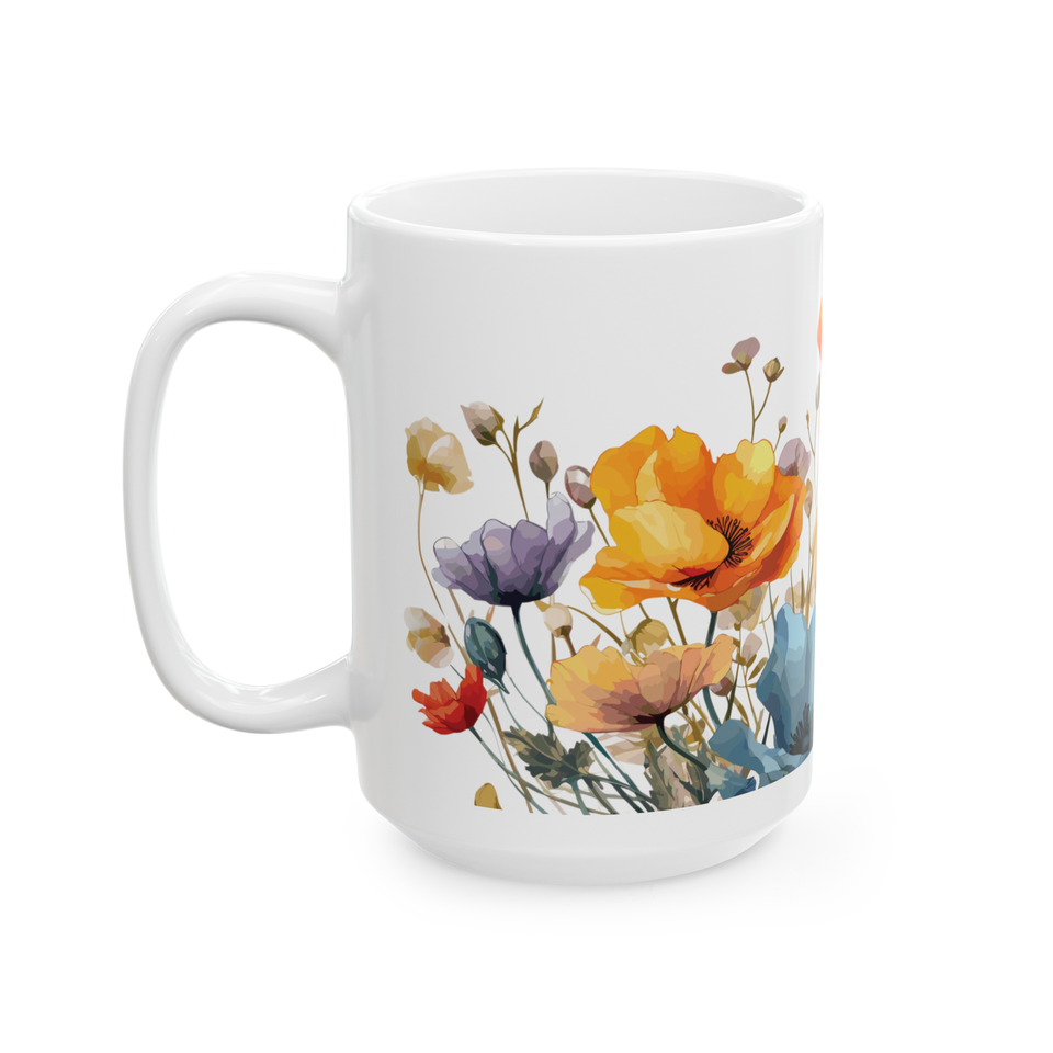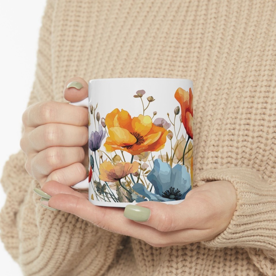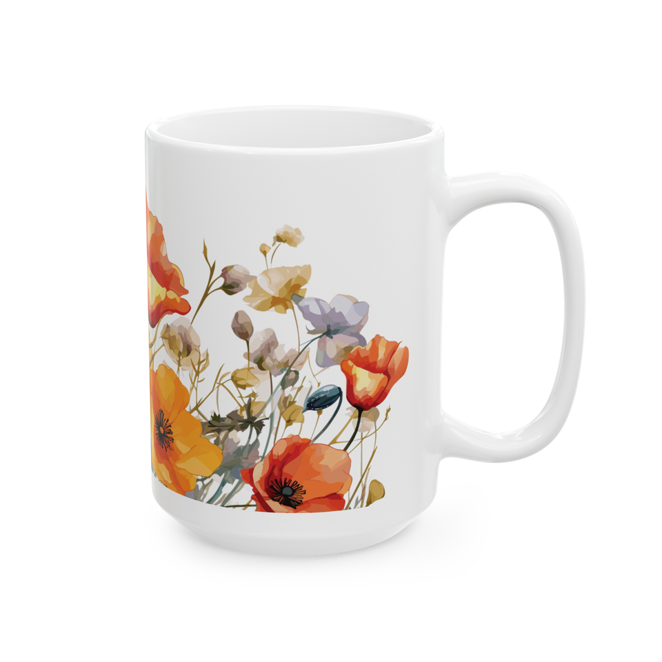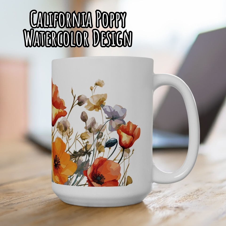 Floral Coffee Cup, California Poppy Watercolor Design, Ceramic Mug, Gift for Her (11, 15oz)