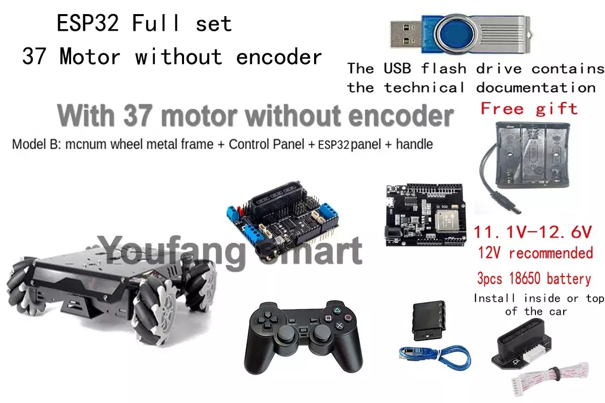 ESP32 Full set: 1 set Robot car + 4pcs DC motor no encoder + ESP32 controller + Battery compartment (Free gift)+ USB flash drive (Free gift have technical document. without battery)
