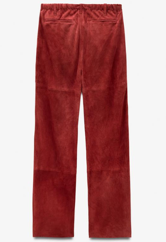 Mid-waist burgundy trousers made from 100% suede leather. Waist with belt loops and elasticated back adjustable with drawstrings. Side pockets. Topstitch detail. Wide leg. Front zip, button and metal hook fastening.