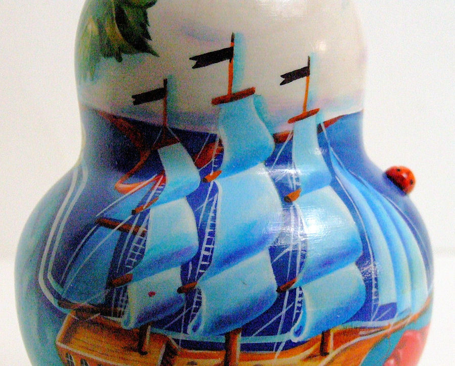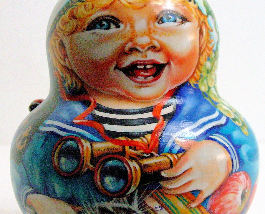 Une belle piece de la tres talentueuse artiste Natasha Lapina "Female Sailor". Ce n'est pas une poupee gigogne mais une Nevalashka en russe signifiant Rolly Polly en anglais. Il y a une cloche a l'interieur de la poupee qui sonne lorsque la piece est poussee ou secouee. C'est une ?uvre d'art unique en son genre. Cet artiste est diplome de l'ecole d'art Symbrisk. L'excellente illustration presente une femme marin avec son chapeau de voile avec l'embleme de l'armee rouge sovietique. Sur le dos de la poupee un voilier est peint avec de belles couleurs. Sur ses genoux, elle a son chaton avec elle stockee dans un panier de transport. Il y a une coccinelle faite a la main sur le cote de la piece avec des pommes, des raisins. et du materiel de lecture. La taille de la piece est de 5,5 pouces de haut et 4 pouces de large ou 14 par 10 cm. Le Nevalashka est signe par l'artiste en bas. La finition laquee est une finition mate.