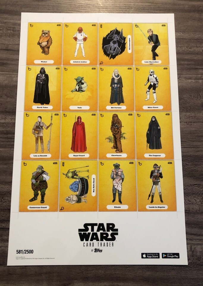 This is a TOPPS STAR WARS RETURN OF THE JEDI NYCC EXCLUSIVE UNCUT SHEET OF CARDS PROMO POSTER. It Is NEW. Poster measures 11 X 17 inches. On a Nice GLOSSY HEAVY STOCK paper. It is a piece of art! Given out as a promo item at The Topps Booth at the NEW YORK COMIC CON in 2016. This is an exclusive numbered poster and was limited to only 2500 prints. This is #581 . This is Would look AMAZING framed. Great for a Bedroom, Dorm Room, Office, Ect. Made as a promotion for TOPPS Star Wars Card Trader App. Combine auctions to save on shipping. DAG