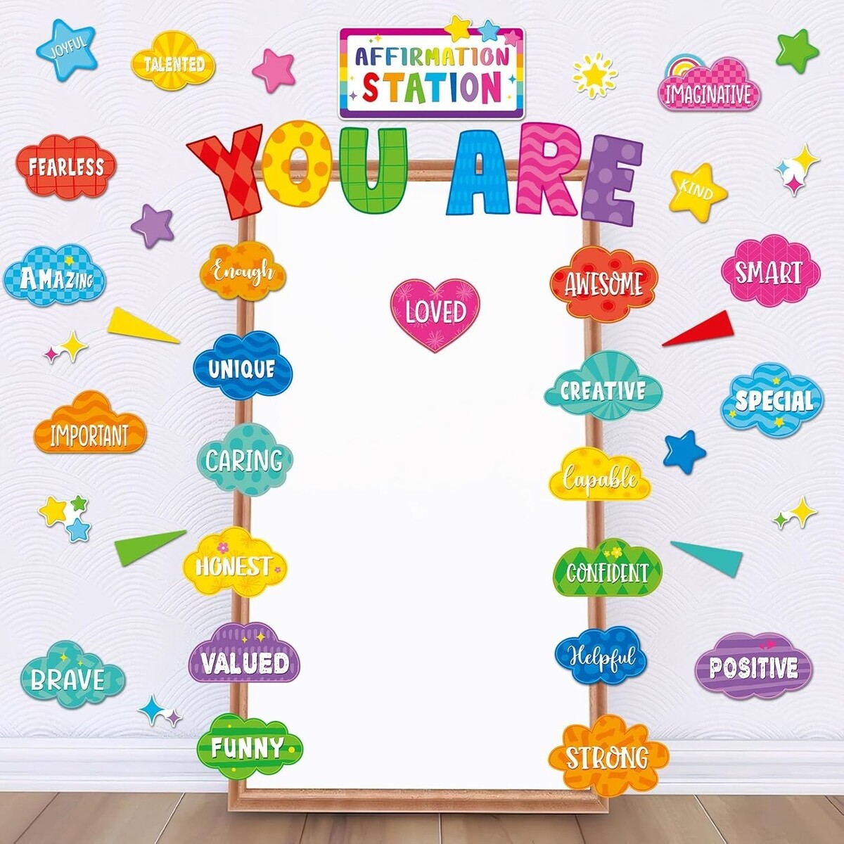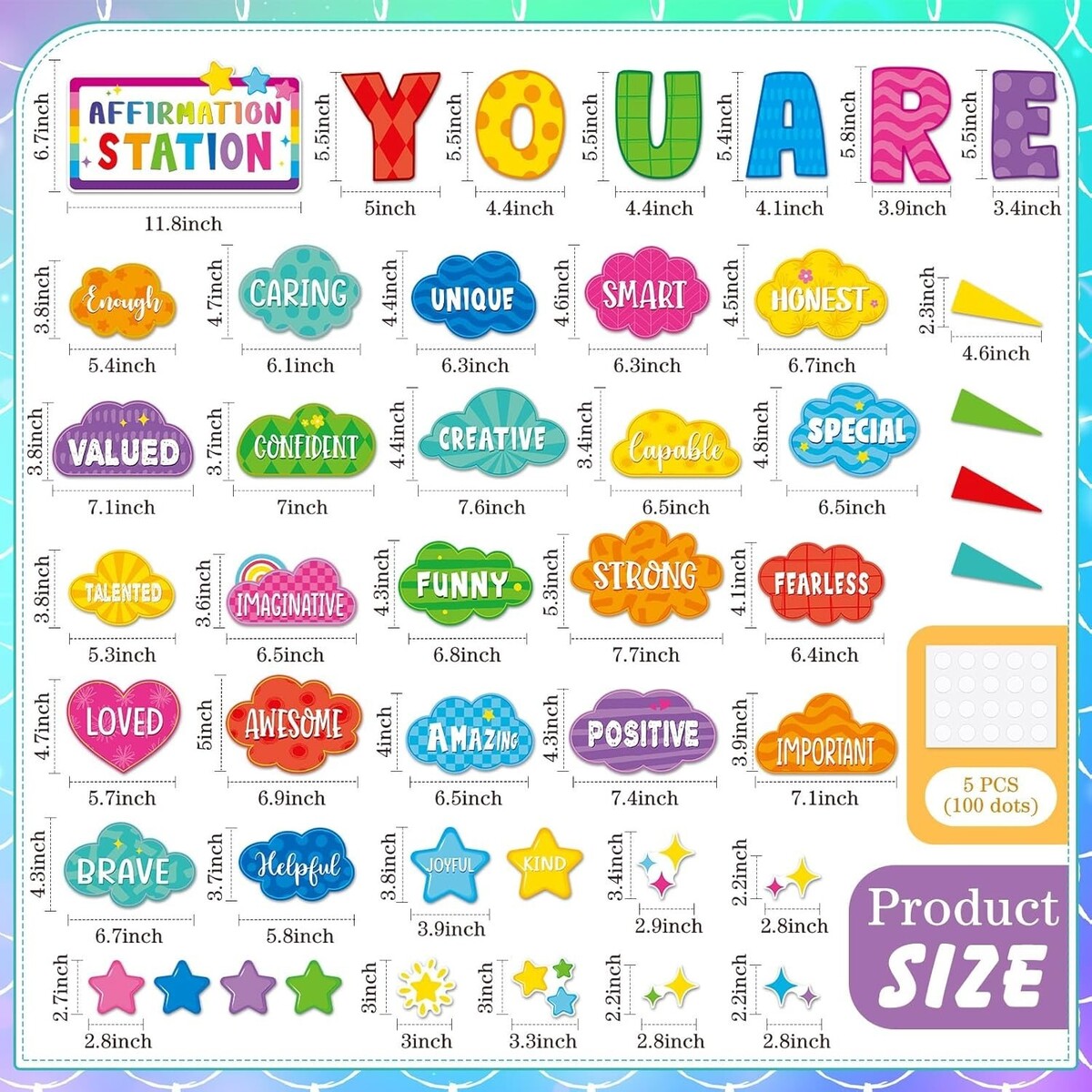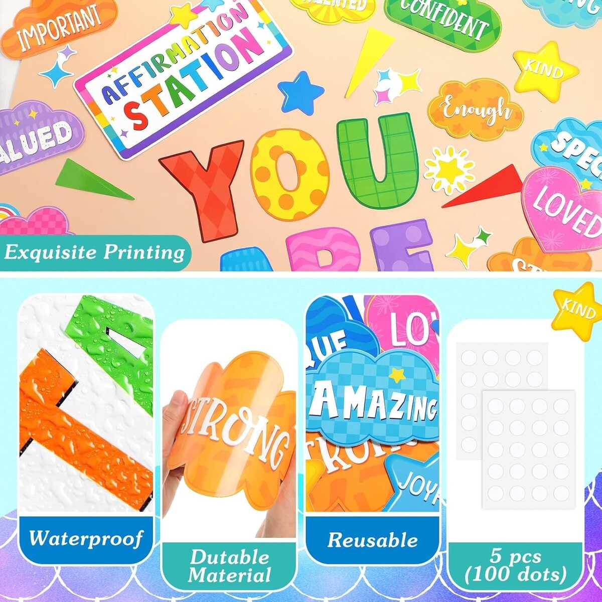 Unique Design: these classroom bulletin board set adopt vibrant color scheme make nice additions to the classroom; There are many motivational words on the bright affirmation station bulletin board, such as creative, unique, loved, enough, kind, honest and so on, which will inspires you and students to keep trying and believing in themselves
