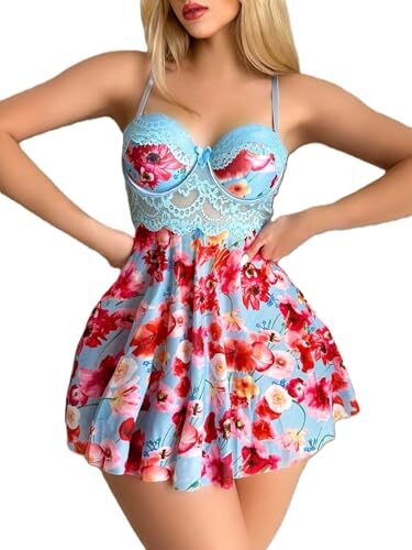 Product description: Elevate your intimate moments with the Trendy Tron Floral Lace Insert Underwire Spaghetti Strap Dress Thong Set from our Sexy Lingerie Collection. This stunning two-piece set features a romantic floral design with contrast lace inserts that create an alluring silhouette. The babydoll dress is designed with adjustable spaghetti straps for a perfect fit and underwire support for enhanced comfort and shape. Crafted from a premium blend of 90% Polyamide and 10% Elastane, the dress offers a slight stretch that hugs your curves beautifully. The matching thong, made of 94% Polyester and 6% Elastane, completes this seductive ensemble. Available in sizes S through XL, this multicolor set showcases an all-over print with random floral patterns that exude femininity. The non-sheer fabric with non-removable padding provides just the right coverage while maintaining its sensual appeal. Hand wash recommended to preserve the delicate materials and intricate details of this captivating lingerie set.