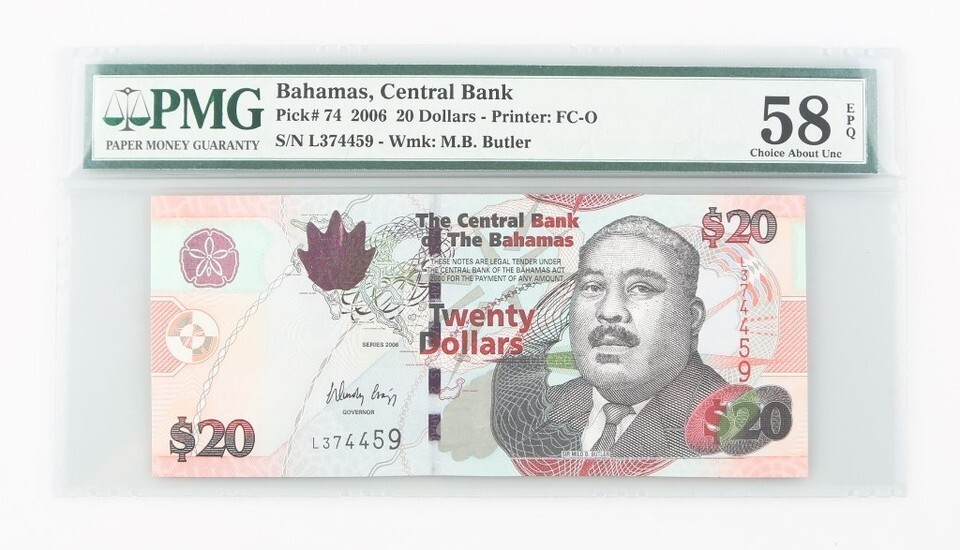 Sealed in a PMG holder with the title "Bahamas, Central Bank // Pick# 74 2006 20 Dollars - Printer: FC-O // S/N L374459 - Wmk: M.B. Butler"
