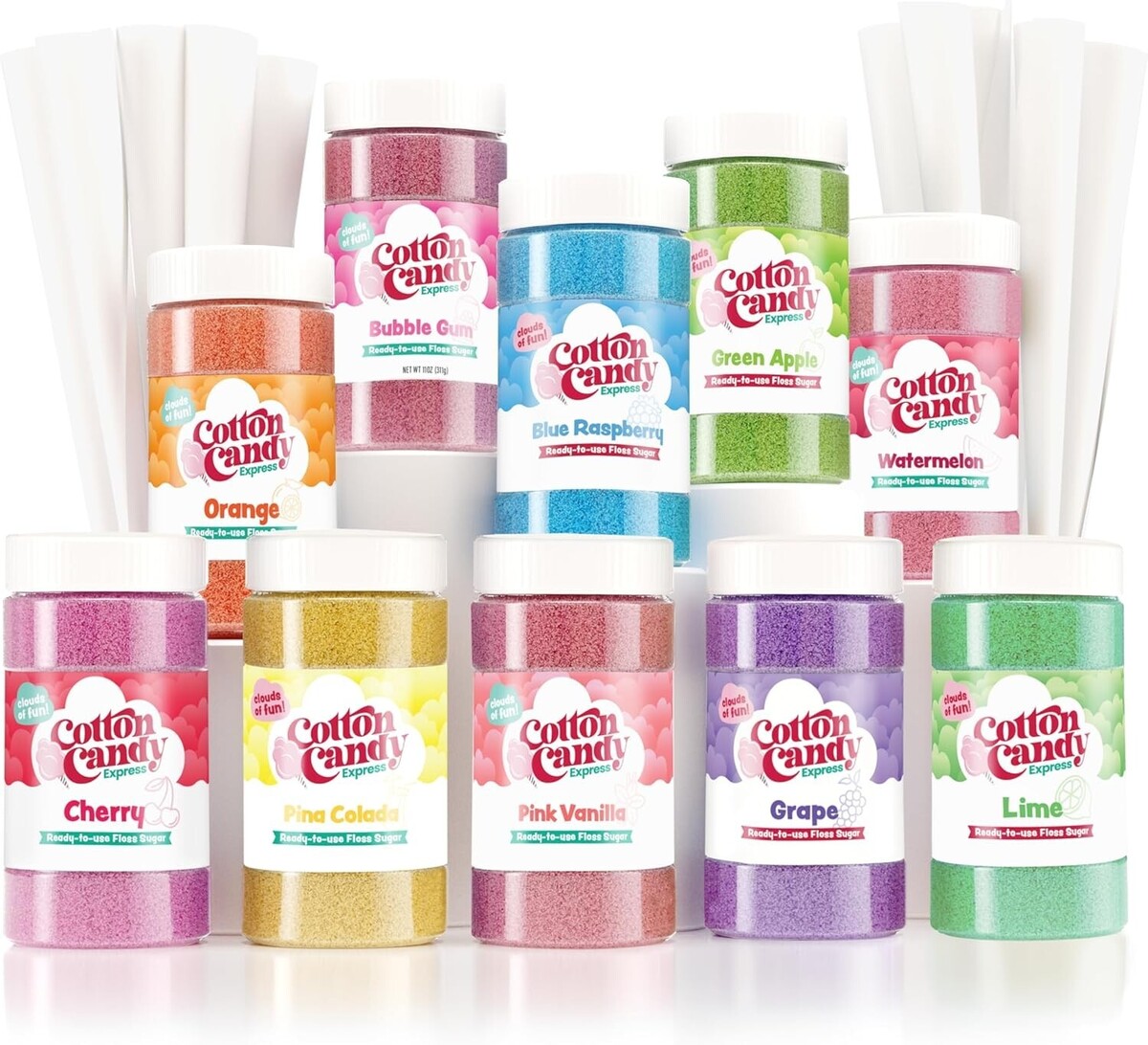 Floss Sugar and Cones Variety Pack with 10 - 11oz Plastic Jars of Assorted Fl...