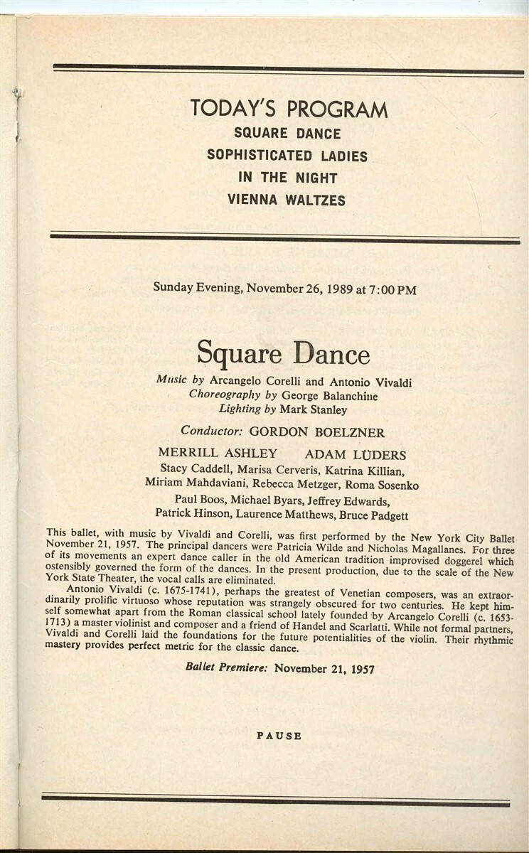 From the 91st New York Season/ Nov 21, 1989 - Feb 25 1990 at the New York Sate Theatre. New York City Ballet Program 91st Season which includes Square Dance, Sophisticated Ladies, In the Night and Vienna Waltz. 118 pages of information, photos and advertising.
