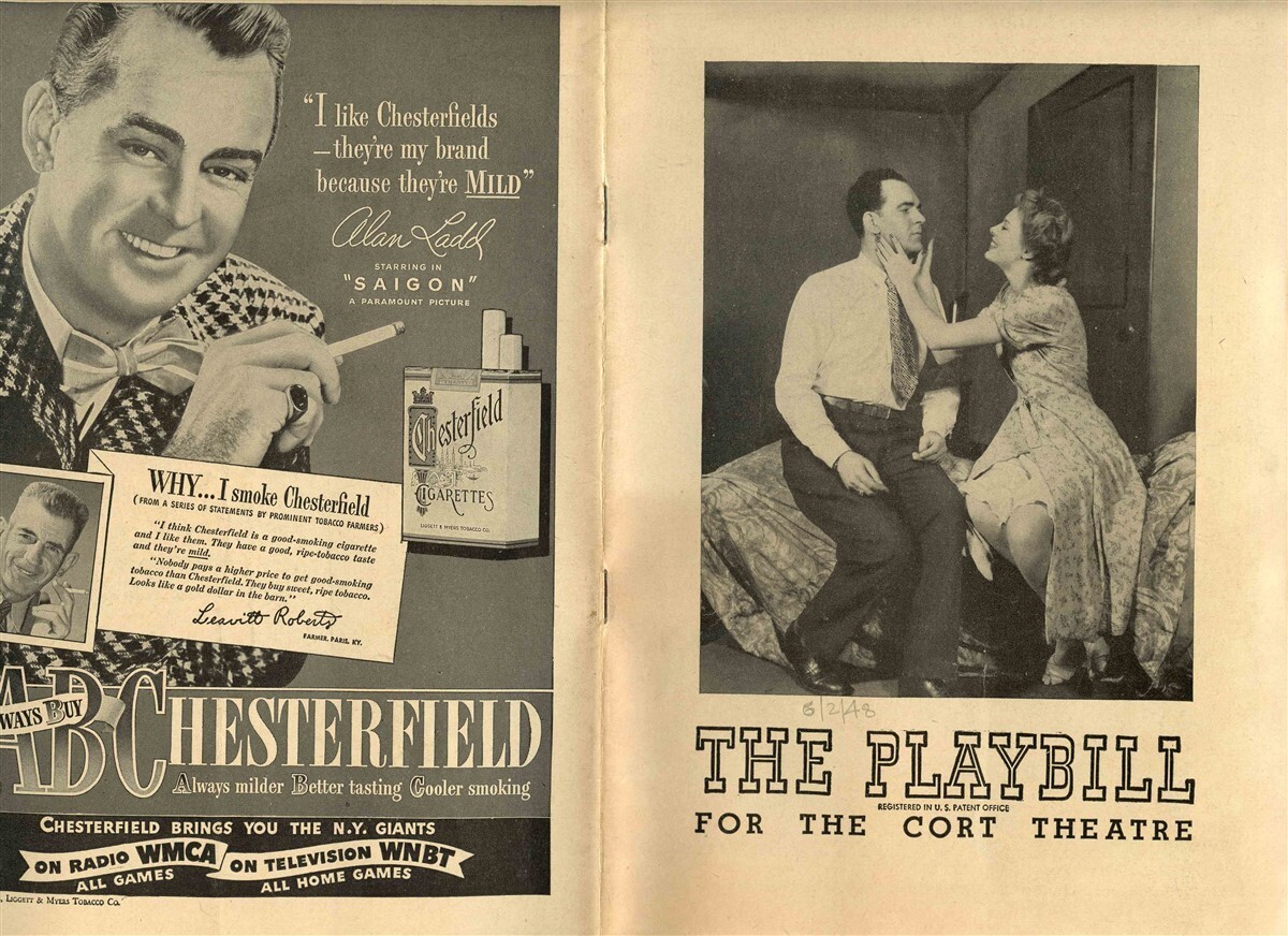 A Playbill for The Respectful Prostitute The Happy Journey at the Cort Theatre in New York City in 1948. Has Alan Ladd ad for Chesterfield on the back cover.