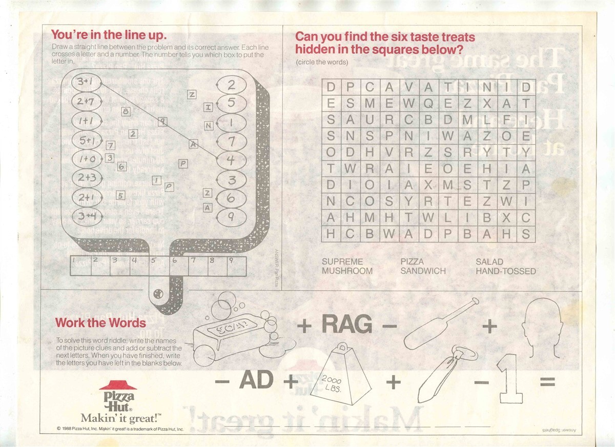 Pizza Hut Makin It Great Placemat Hidden in the Squares Puzzle Back 1988