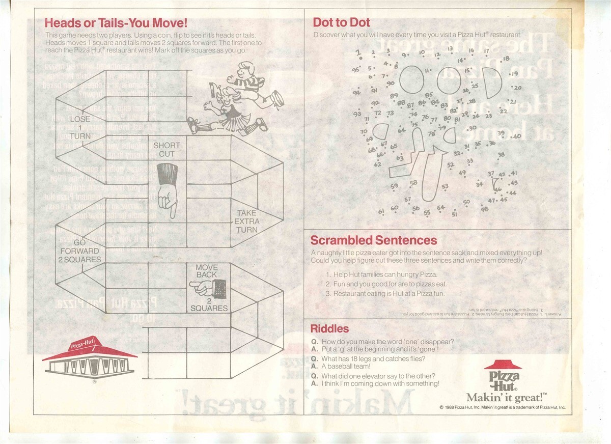 Pizza Hut Makin It Great Placemat Heads or Tails Puzzle Back 1988