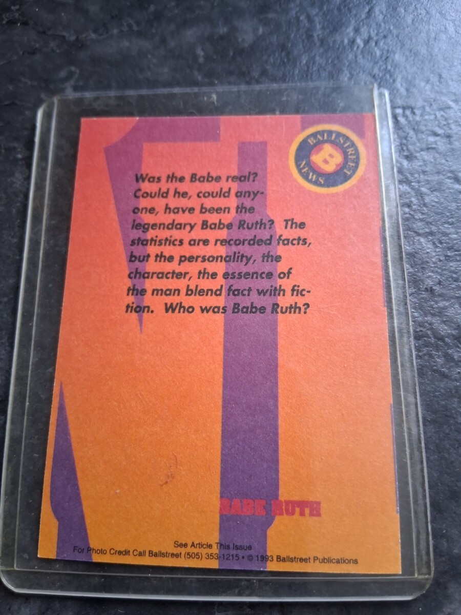 The Babe Ruth trading card from 1993 by Ballstreet News is a standard-sized sports trading card featuring the legendary Major League Baseball player. This original card, made of card stock, showcases Babe Ruth during the 1993 season with the New York Yankees. Although it is not autographed or graded, this collectible item celebrates the iconic player in English language, perfect for any baseball fan or card collector looking to add a piece of history to their collection.