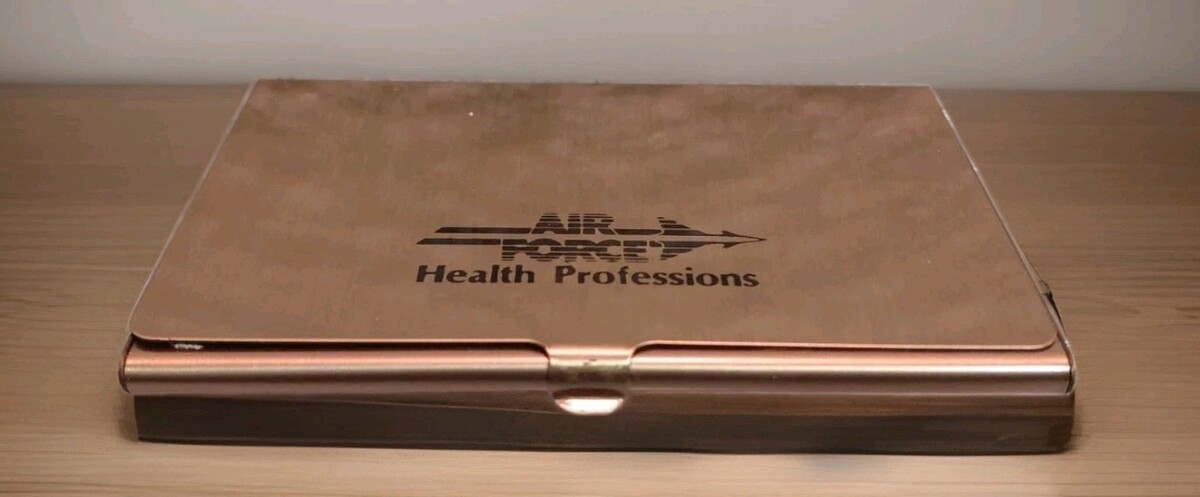 The Vintage Air Force Gold Brass Business Card Holder is a stylish and practical accessory for any office or workspace. Its sleek design, featuring the Air Force model, adds a touch of military-inspired charm to your desk.