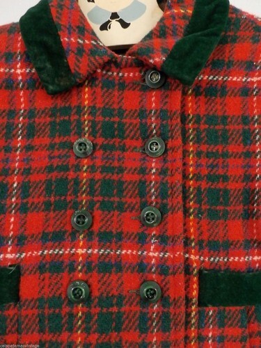 Authentic 1950s Cute Togs girls? snowsuit set, marked size 3. Features a bright red-and-green plaid coat, matching green velvet snow pants (flannel-lined, with zipper legs), and coordinating bonnet. A charming mid-century winter outfit that looks straight out of a 1950s holiday film.