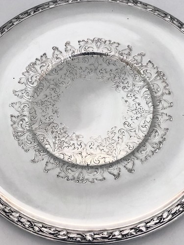 The product is a vintage 10" mid-century Wm. A Rogers Meadowbrook round silver plate tray, etched with a pattern that embodies the mid-century modern style. Made in the United States post-1940, this silverplate tray is a classic piece that showcases the craftsmanship and design of the era. Perfect for collectors or those looking to add a touch of retro elegance to their home decor, this tray is a timeless and unique piece that represents the beauty of post-war American silverware.