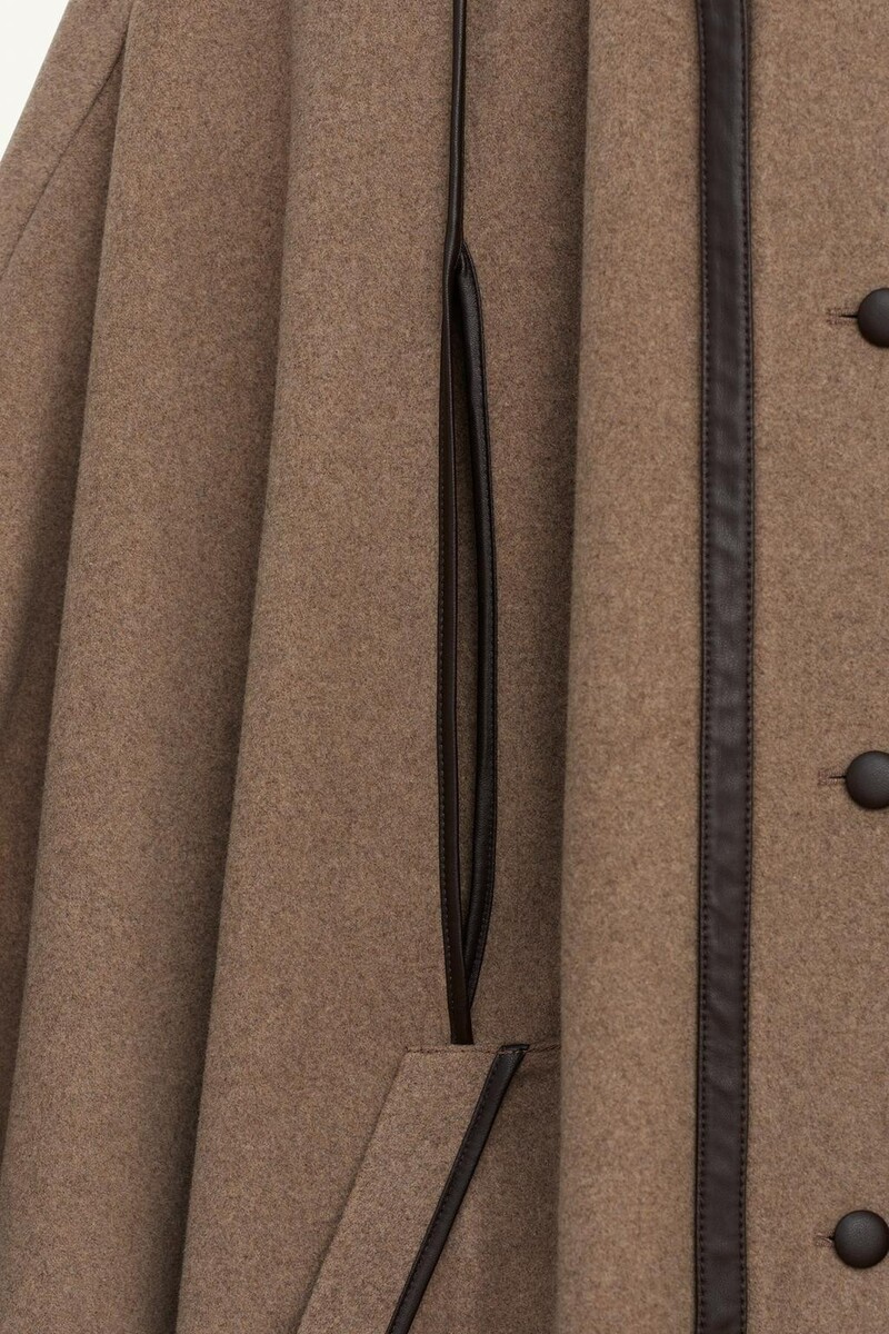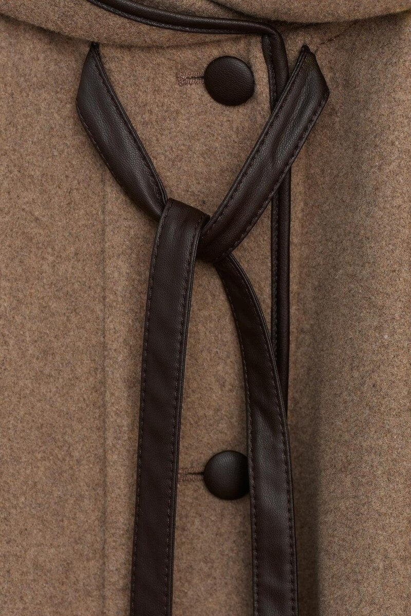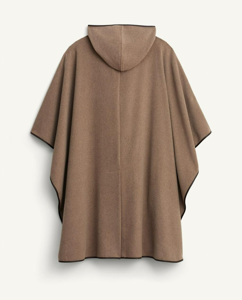 Cape made of 31% wool yarn. Round neck with hoodie. Front pockets. Contrasting trim detail. Straight hem. Front button closure.