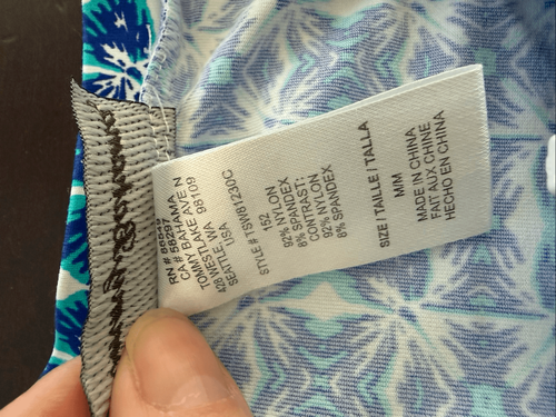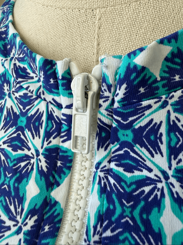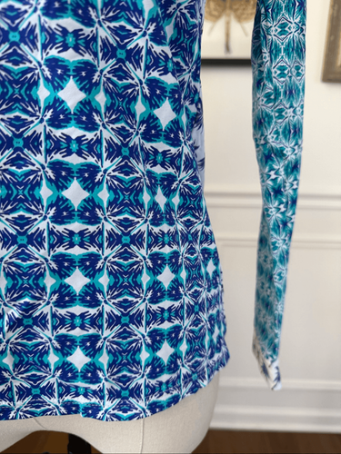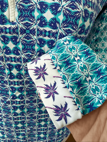 Tommy Bahama kaleidoscope tile II print long sleeve rash guard with zip neck. Contrast pattern, sleeves, cuffs and sides. Various shades of aqua, blue, white and a touch of pink. Pair with your own swim bottoms. Laying flat measures 22 inches shoulder to hem and 18 inches armpit to armpit. Nylon and spandex blend with a good amount of stretch. $140 retail.