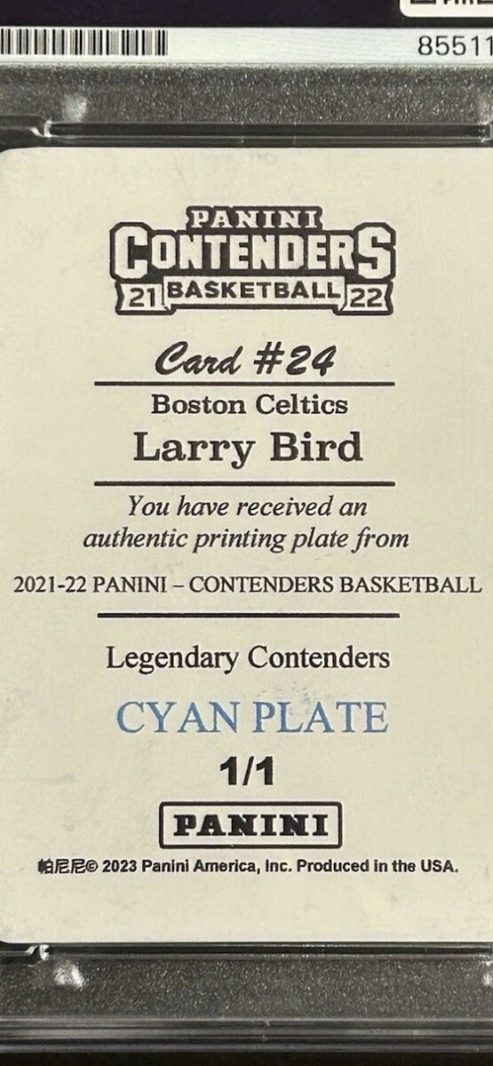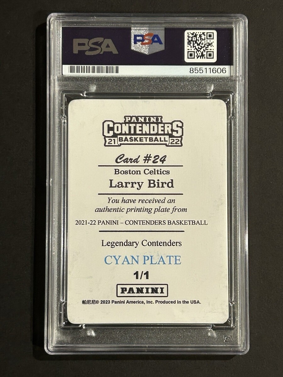 The product is a 2022 Panini trading card featuring an autograph from basketball legend Larry Bird. This one-of-a-kind card is a 1/1 cyan printing plate signed by Bird himself, making it a valuable collector's item for fans of the Boston Celtics and NBA basketball. Authenticated by Professional Sports Authenticator (PSA), this card is a unique piece of memorabilia from one of the greatest players in basketball history.
