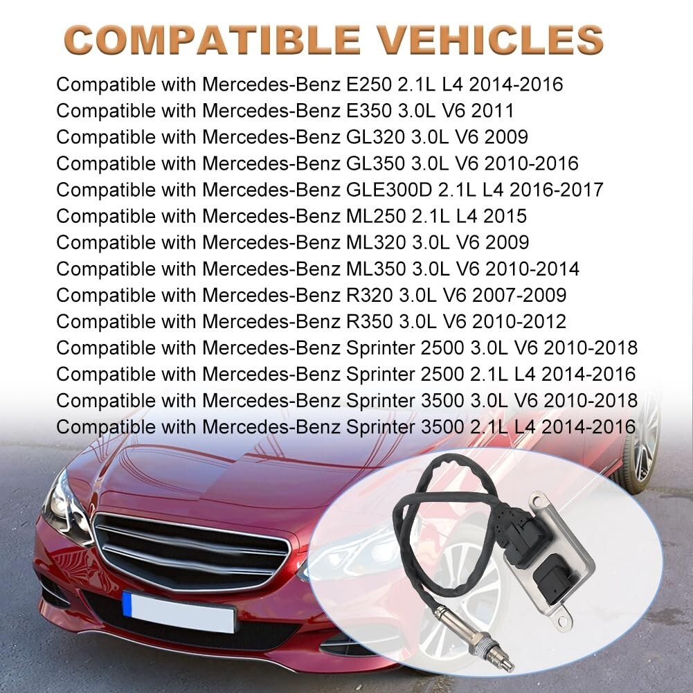 Nitrogen Oxide Sensor Outlet Fits: Compatible with Mercedes-Benz E250 2.1L L4 2014-2016, E350 3.0L V6 2011, GL320/ML320 3.0L V6 2009, GL350 3.0L V6 2010-2016, GLE300D 2.1L L4 2016-2017, ML250 2.1L L4 2015, ML350 3.0L V6 2010-2014, ML350 3.0L V6 2010-2014, R320 3.0L V6 2007-2009, R350 3.0L V6 2010-2012, Sprinter 2500/3500 3.0L V6 2010-2018, Sprinter 2500/3500 2.1L L4 2014-2016