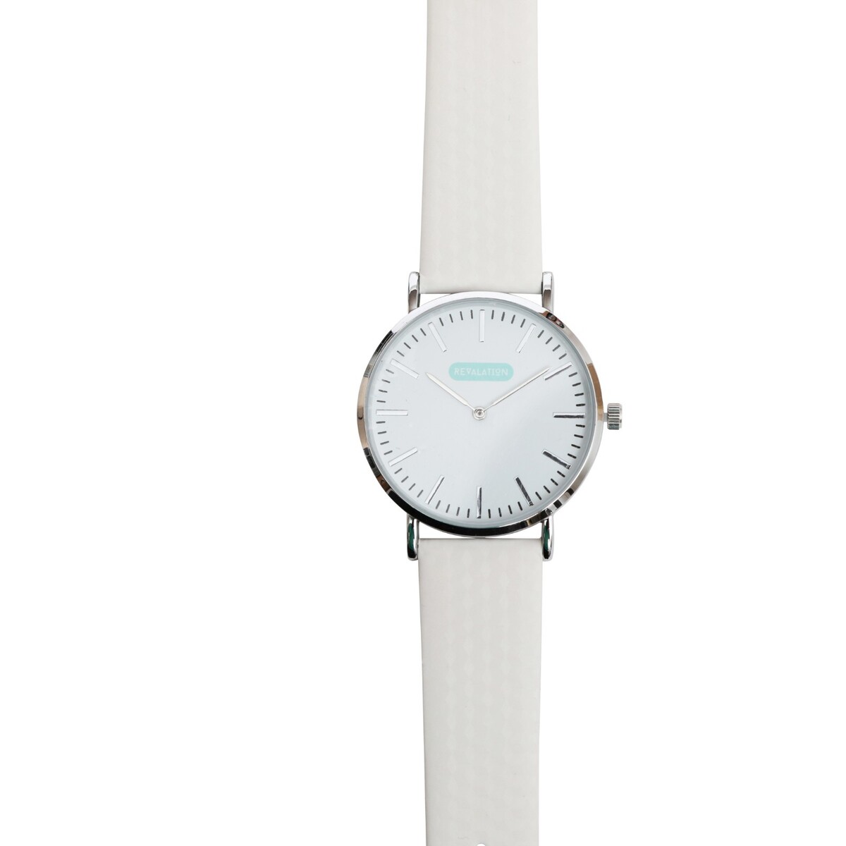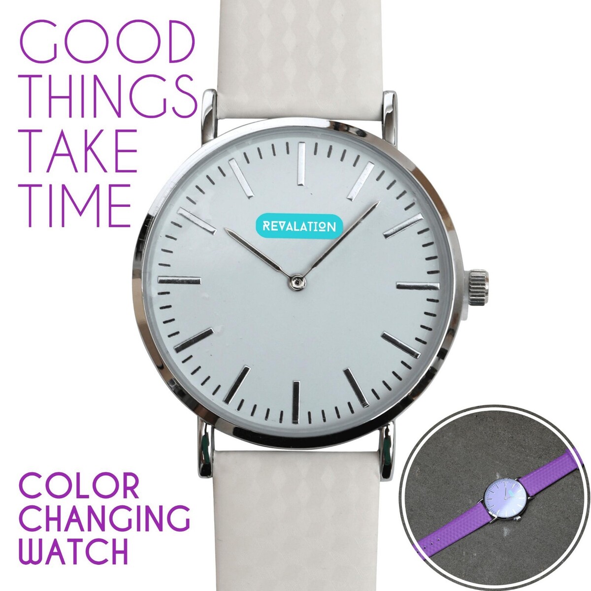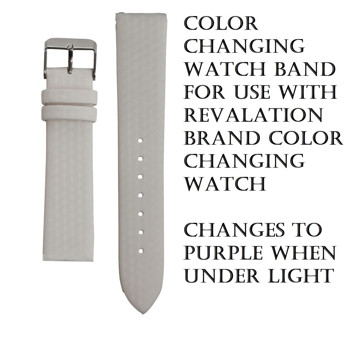 Ok so you love great technology and you love fun and fashionable items. So thats a tough act to follow. But it just so happens REVALATION brand has a special item that will suit your needs. This scientifically impossible watch, starts out white, then changes color to purple when the light is on it either from the sun or a strong lamp. Meaning, the minute you go outside your watch will turn PURPLE! We know your going to love this watch so much we sell an extra band in case you want to wear it every day. Enjoy this great watch from REVELATION. Packed in a REVALATION velvet pouh for easy travel and care.