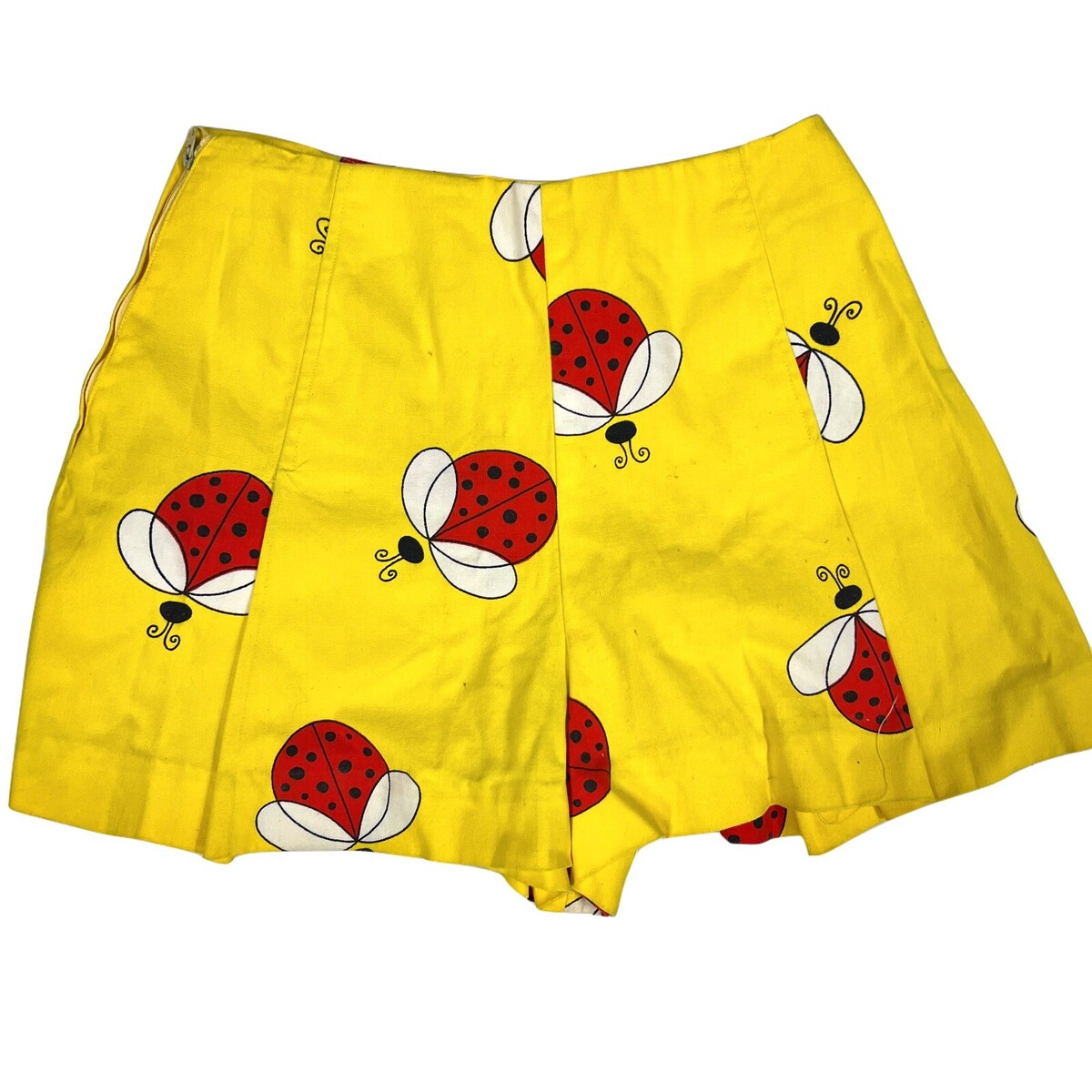 Vintage 1970s high-waisted shorts with a 1940s-inspired silhouette, featuring a whimsical yellow fabric printed with red ladybugs. Designed with pleats, side zip closure, and a playful red button detail, these homemade shorts are a charming blend of retro novelty and practical summer wear.