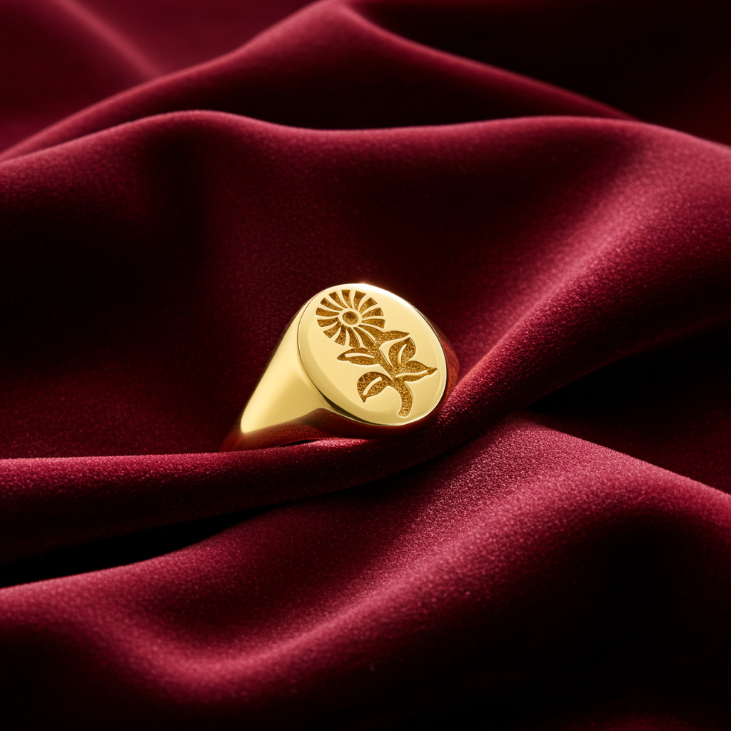 This elegant women?s signet ring features a rounded oval face with a finely engraved sunflower design, symbolizing warmth, growth, and positivity. Crafted with a smooth polished finish, the ring offers a classic yet feminine look that?s easy to wear every day. The hollow back construction keeps the ring comfortable and lightweight while maintaining a bold, timeless presence. Available in both 10K and 14K gold purity, and offered in yellow or white gold to suit your style.