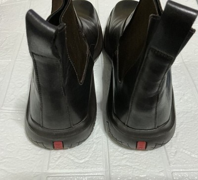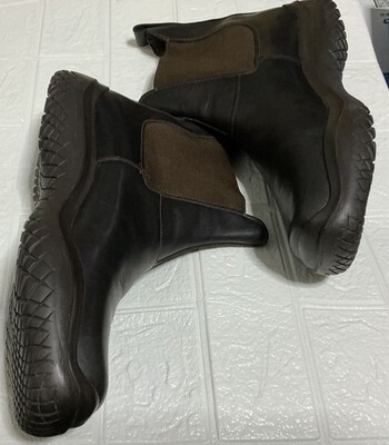 These Men's Vintage Authentic PRADA Runway Hybrid Vibram leather boots in US size 9 and UK size 8 are a stylish and unique addition to any man's wardrobe. With a square toe, ankle shaft style, and pull-on closure, they offer a classic and comfortable fit. The brown color and leather upper material make them versatile for casual or business occasions, while the Vibram outsole provides durability and traction. These boots are a piece of fashion history from the 1999 PRADA Vibram collection, showcasing the brand's signature style and quality craftsmanship. Perfect for the winter and fall seasons, these vintage PRADA boots are a must-have for any fashion-forward man. Does not come with a box only a dust bag 100% authentic.