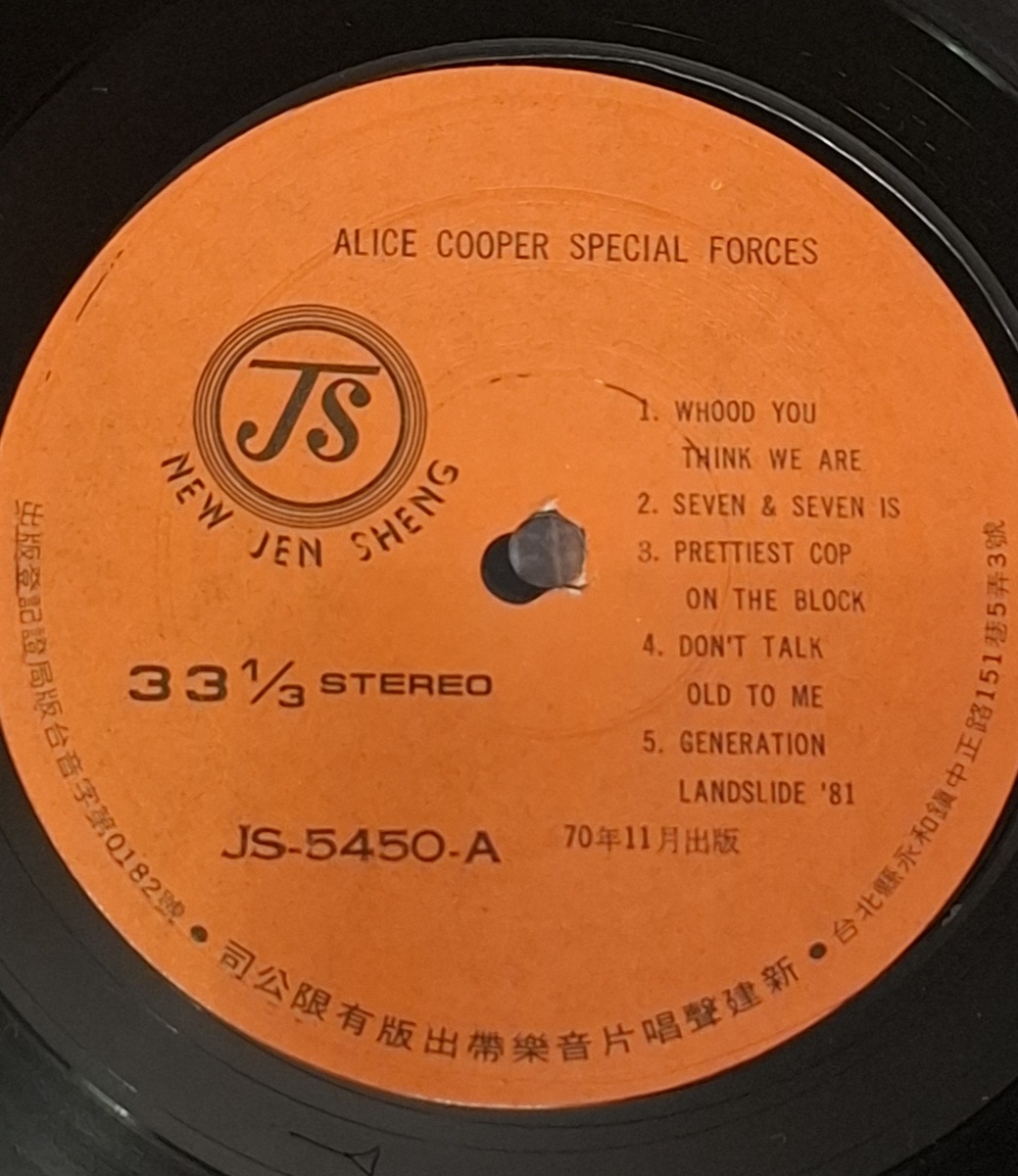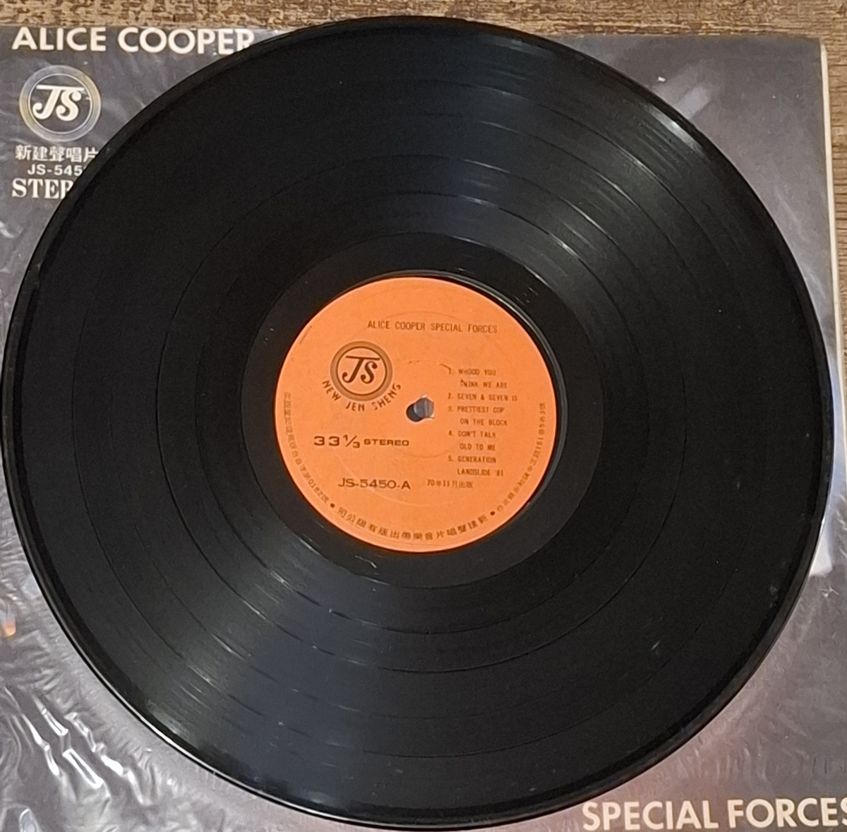 Authentic Taiwan pressing of Alice Cooper?s Special Forces on the New Jen Sheng / ????? label. Great collectible copy for fans of classic rock / hard rock and international pressings.