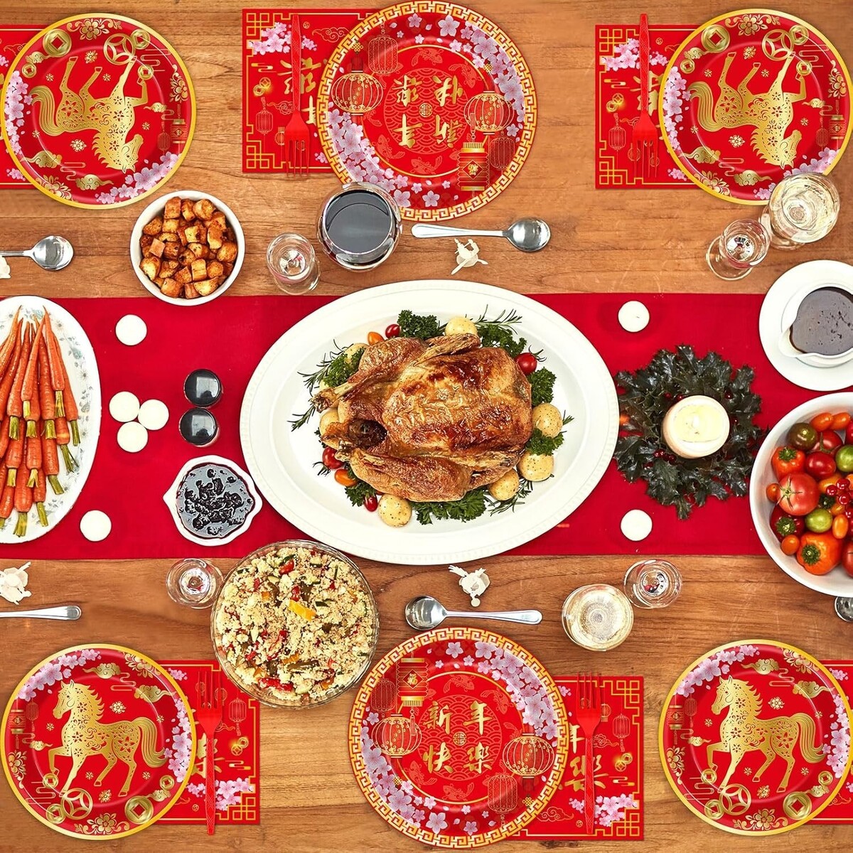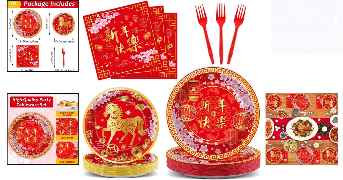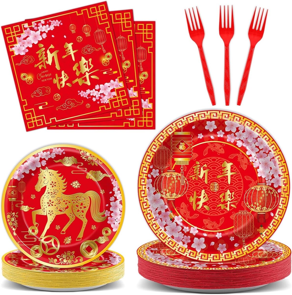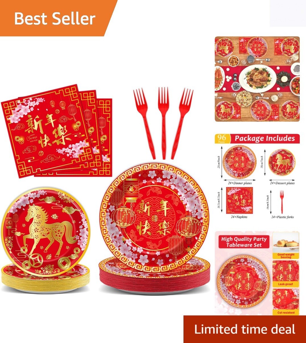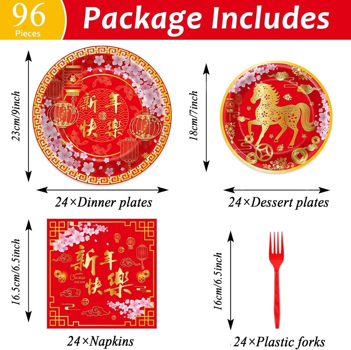 Celebrate the of the Horse in style with this complete 96-piece party pack! Our thoughtfully curated tableware set not only serves your guests with elegance but also enhances the cultural essence of your festive gathering. Featuring vivid designs and quality materials, this set is tailored for unforgettable memories, bringing joy and warmth to your table as you ring in a prosperous new .